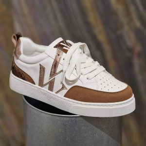 Basket monogramme Joyce blanc et camel de chez VANESSA WU.