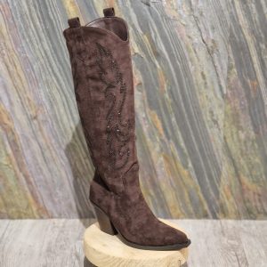 Santiag haute en nubuck marron chocolat, avec les détails en strass assortis.