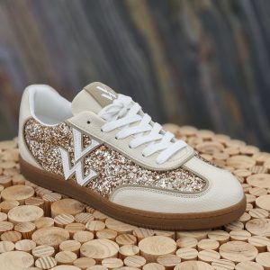 Basket monogramme Suzanne or et beige à semelle rétro de chez VANESSA WU
