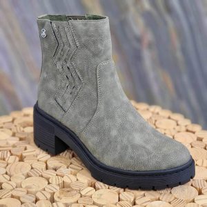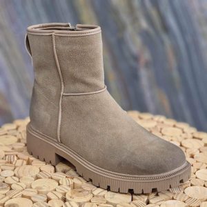 Santiag à talon carré, en similicuir avec aspect reptile et aspect daim beige et blanc.