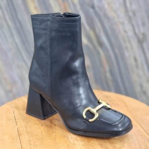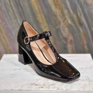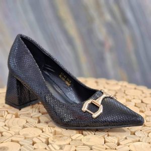 Escarpin noir imprimé serpent, pointu. A talon géométrique carré.