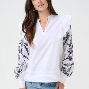 Blouse Alice blanche avec broderie noire aux manches et froufrous aux épaules de chez Cream.