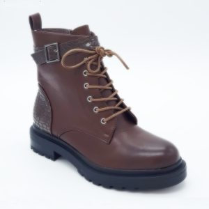 Bottine Santiag bi-matière, en nubuck marron glacé et aspect brossé taupe. A talon carré de 7 cm.