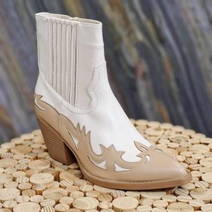 Santiag à talon carré, en similicuir avec aspect reptile et aspect daim beige et blanc.