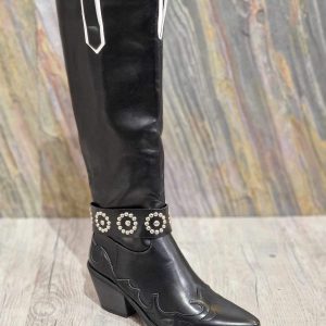 Botte santiag noire, en similicuir. Détails biais blancs et clous argentés.