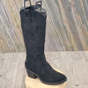 Botte en nubuck noire, avec bout arrondi. Et détail arrondi sur le haut de la botte et une étoile en paillette noir sur l’arrière de la chaussure.