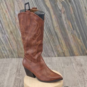 Santiag haute en similicuir brossé camel, avec les détails de surpiqûres camel.