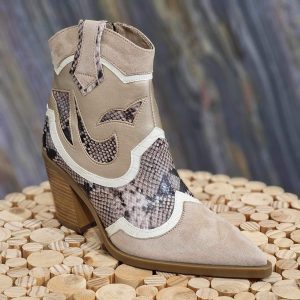 Santiag à talon carré, en similicuir avec aspect reptile et aspect daim beige et blanc.