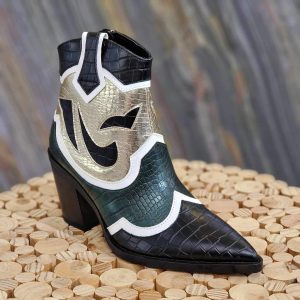 Santiag à talon carré, en similicuir avec aspect reptile, quadricolore : noir, vert, doré et blanc.
