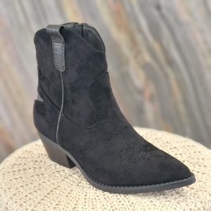 Santiag à talon carré, en nubuck noir avec aspect reptile sur l’étoile arrière de la chaussure.