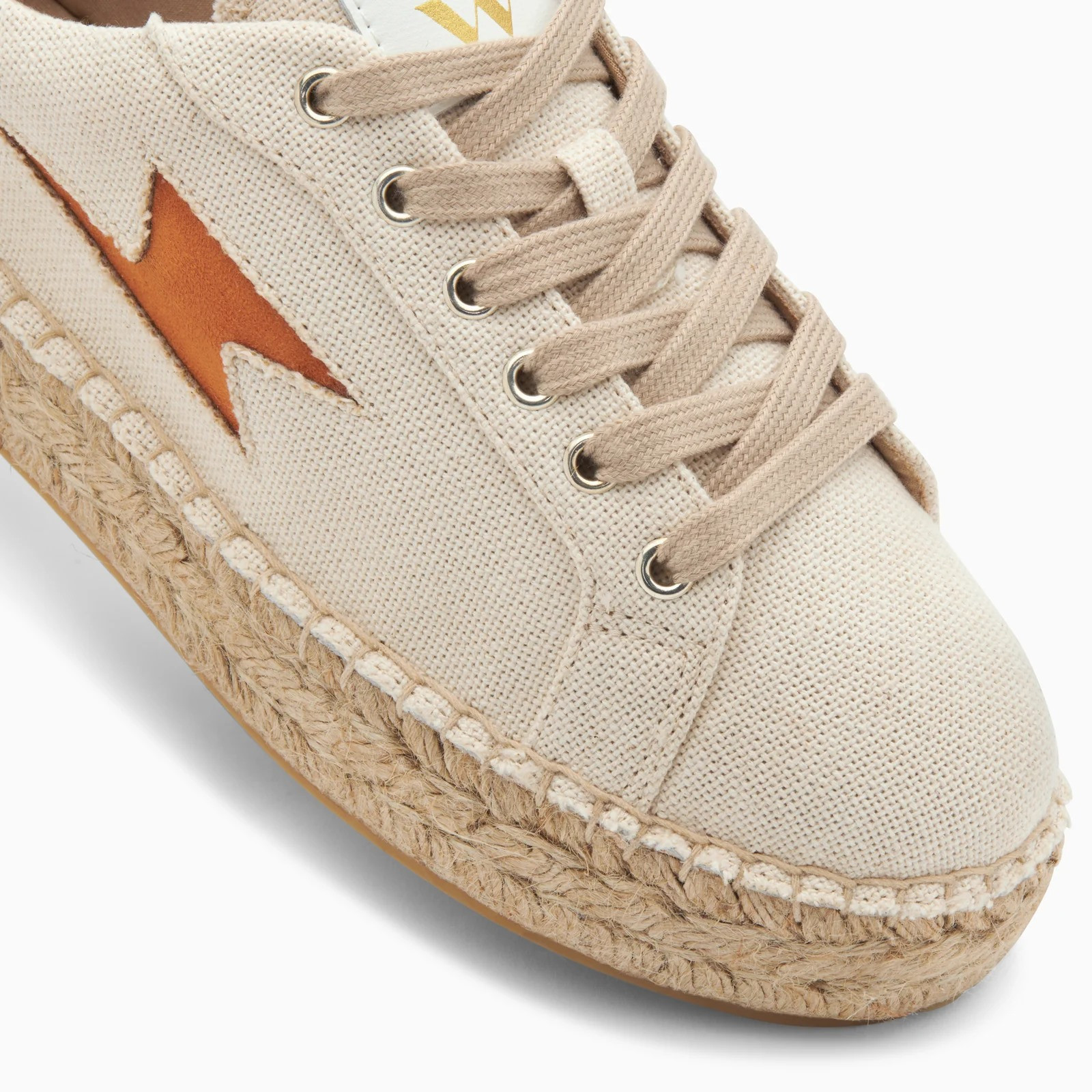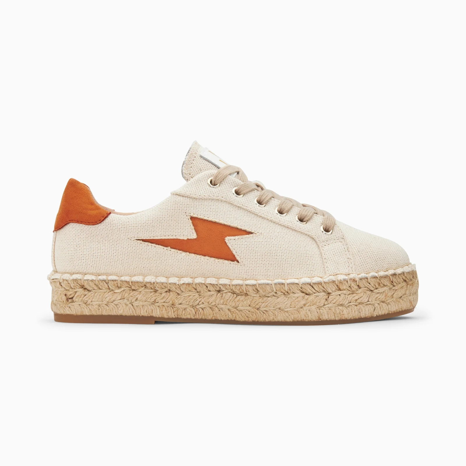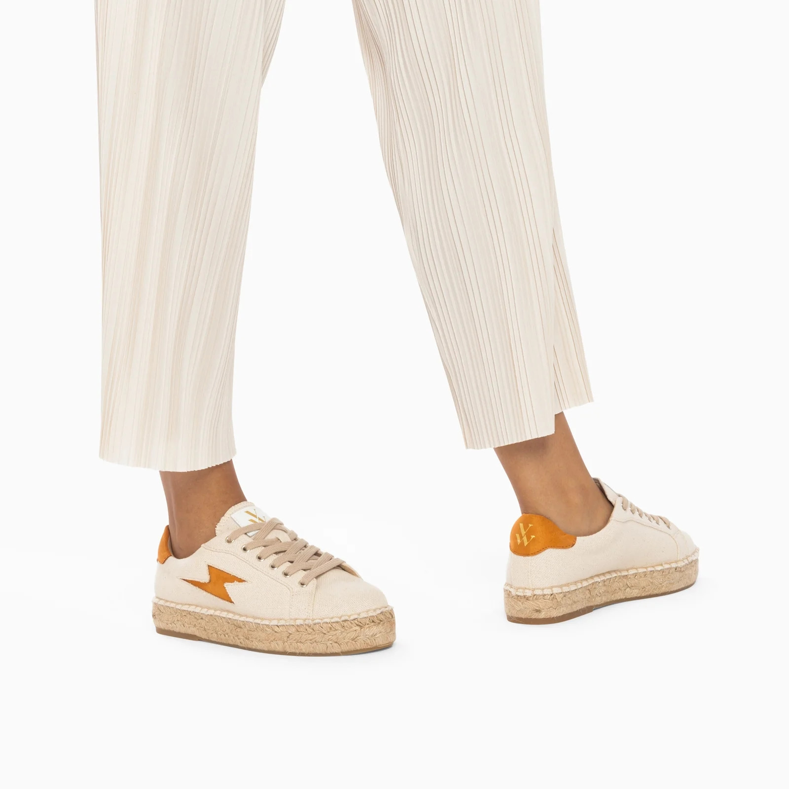- Découpe en forme d'éclair et patch arrière en suédine orange ocre