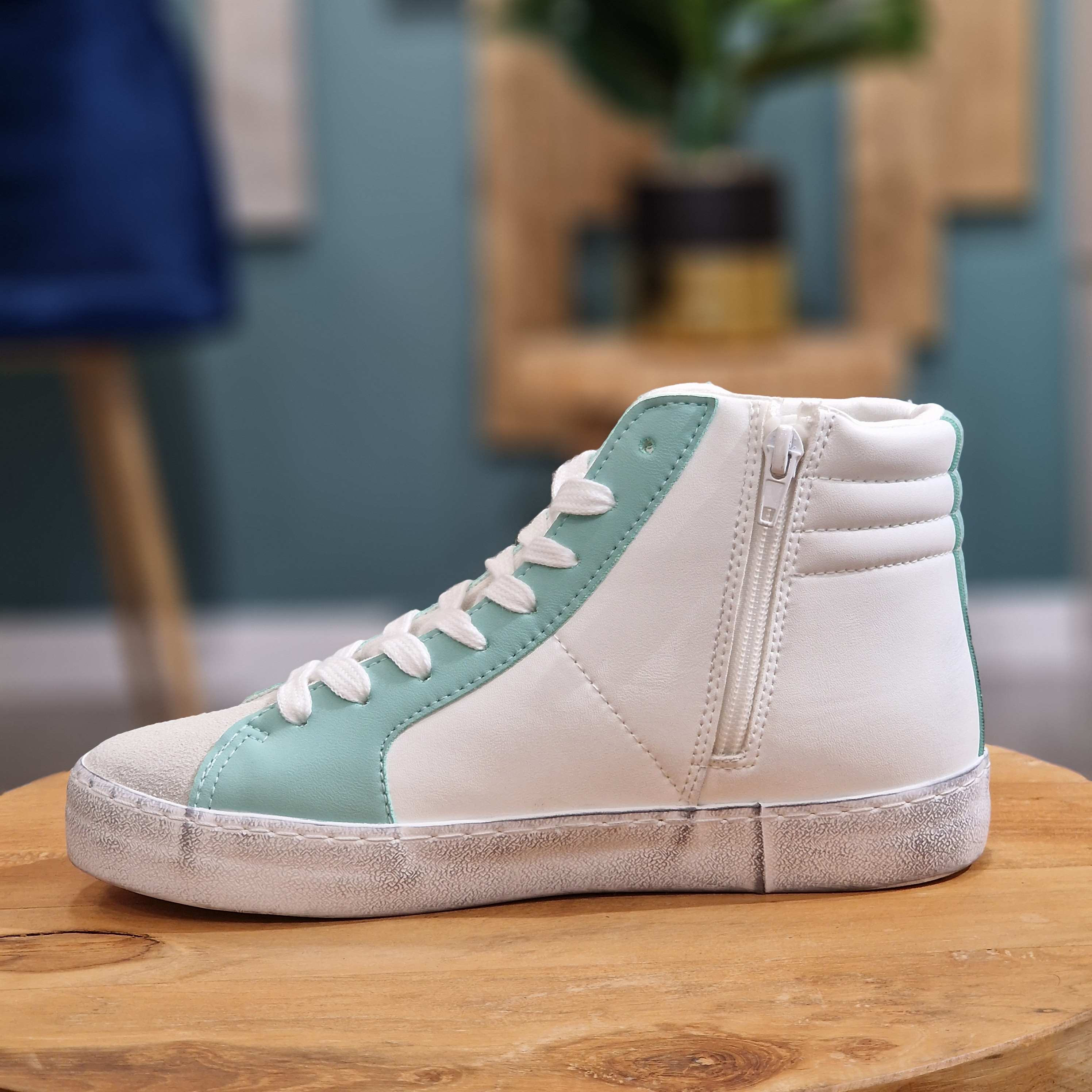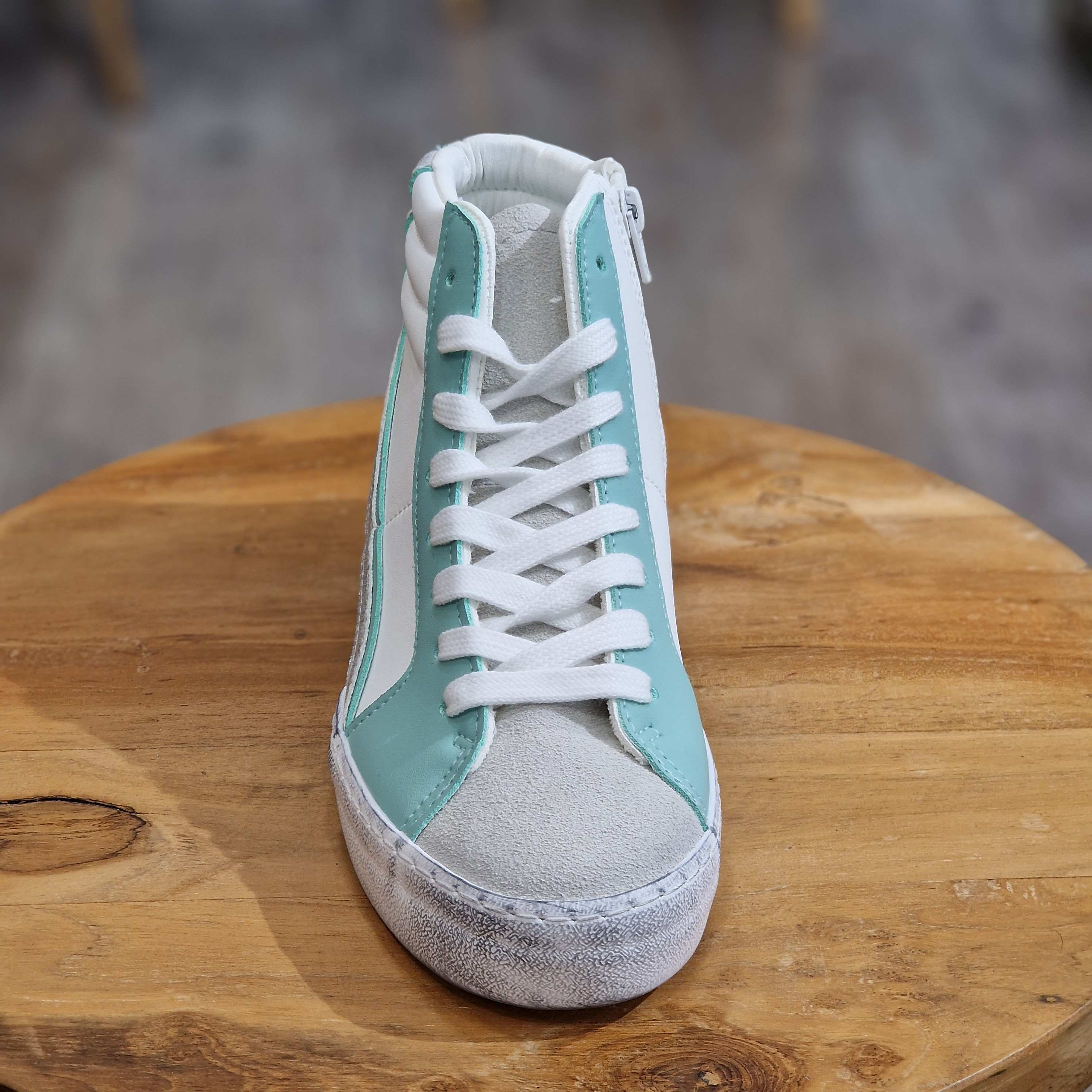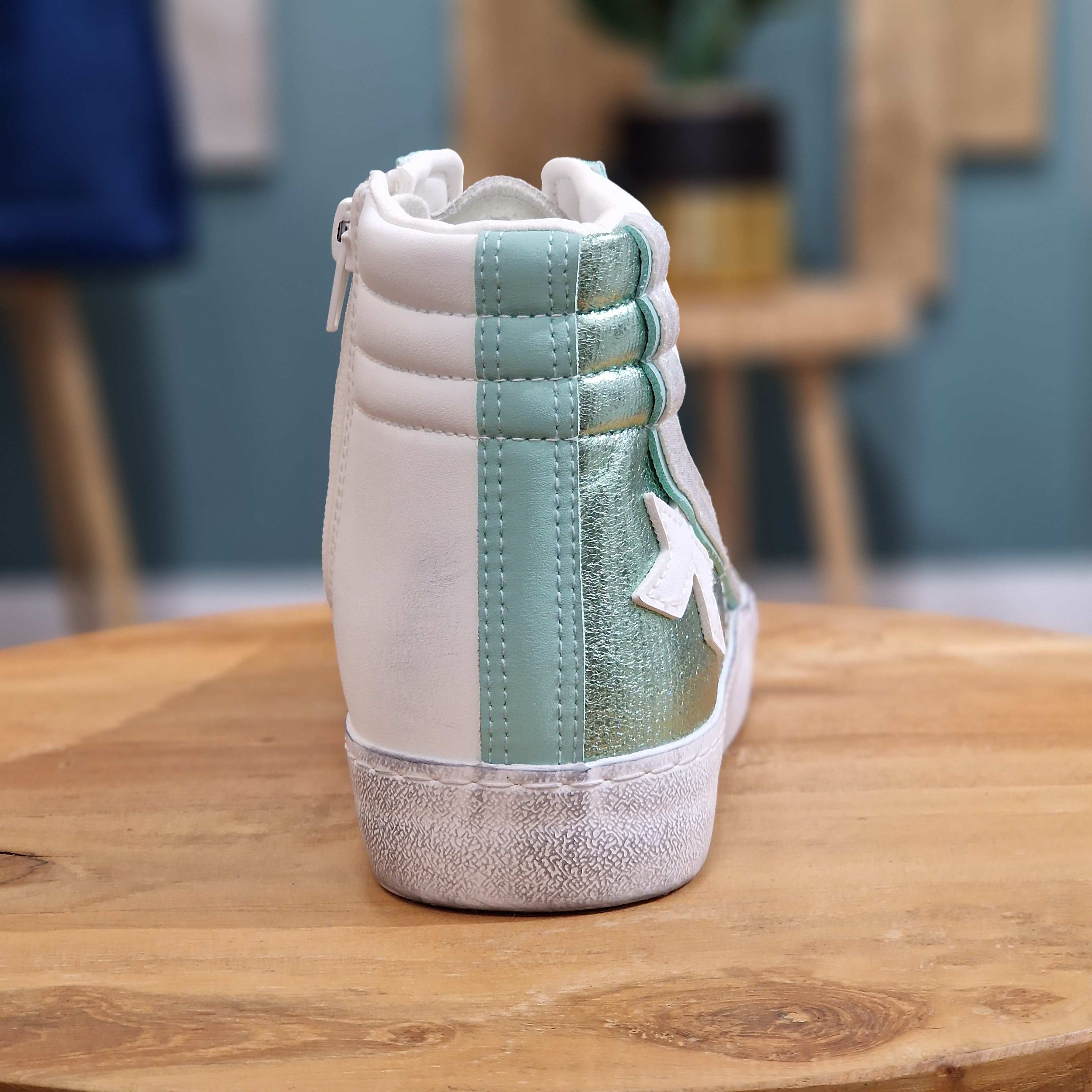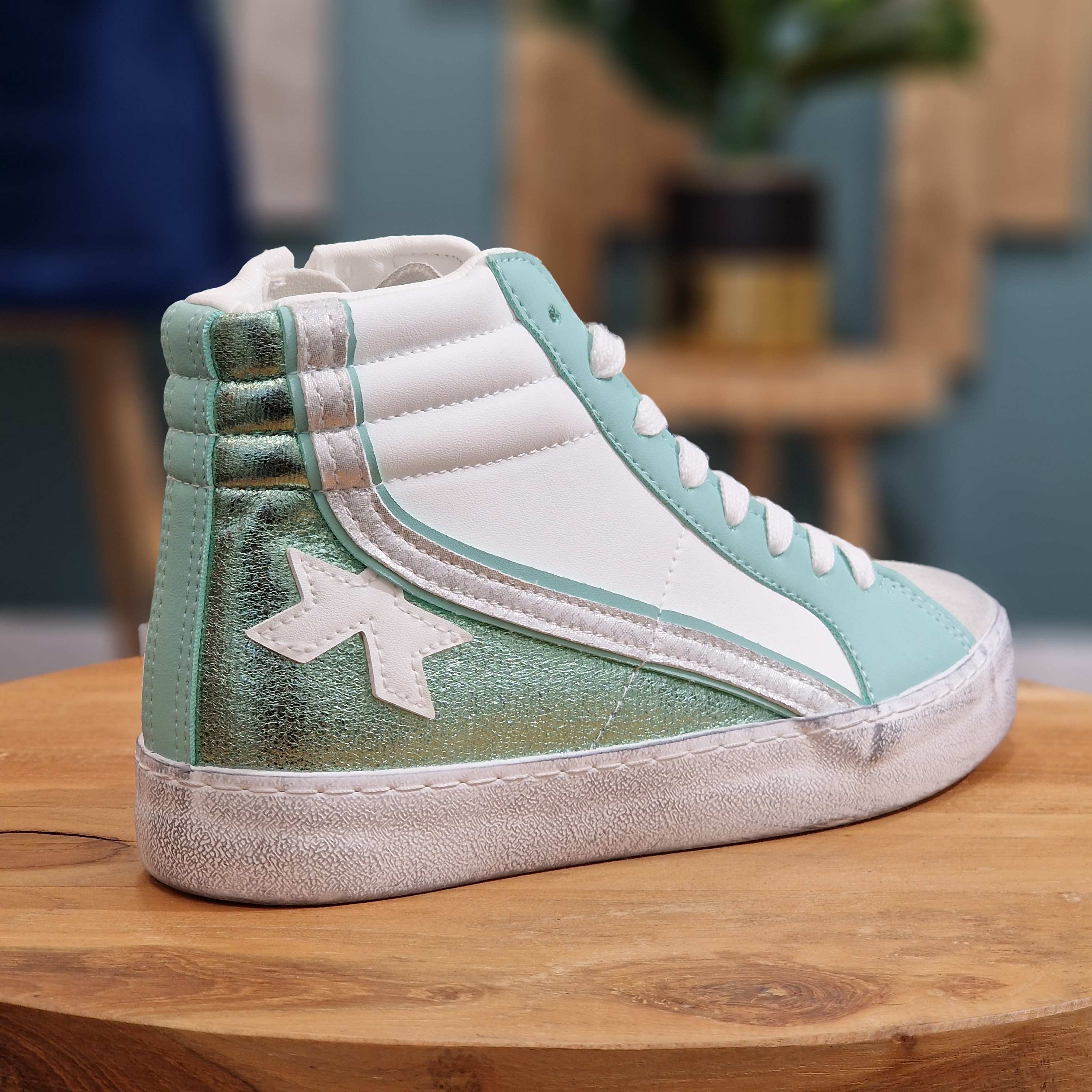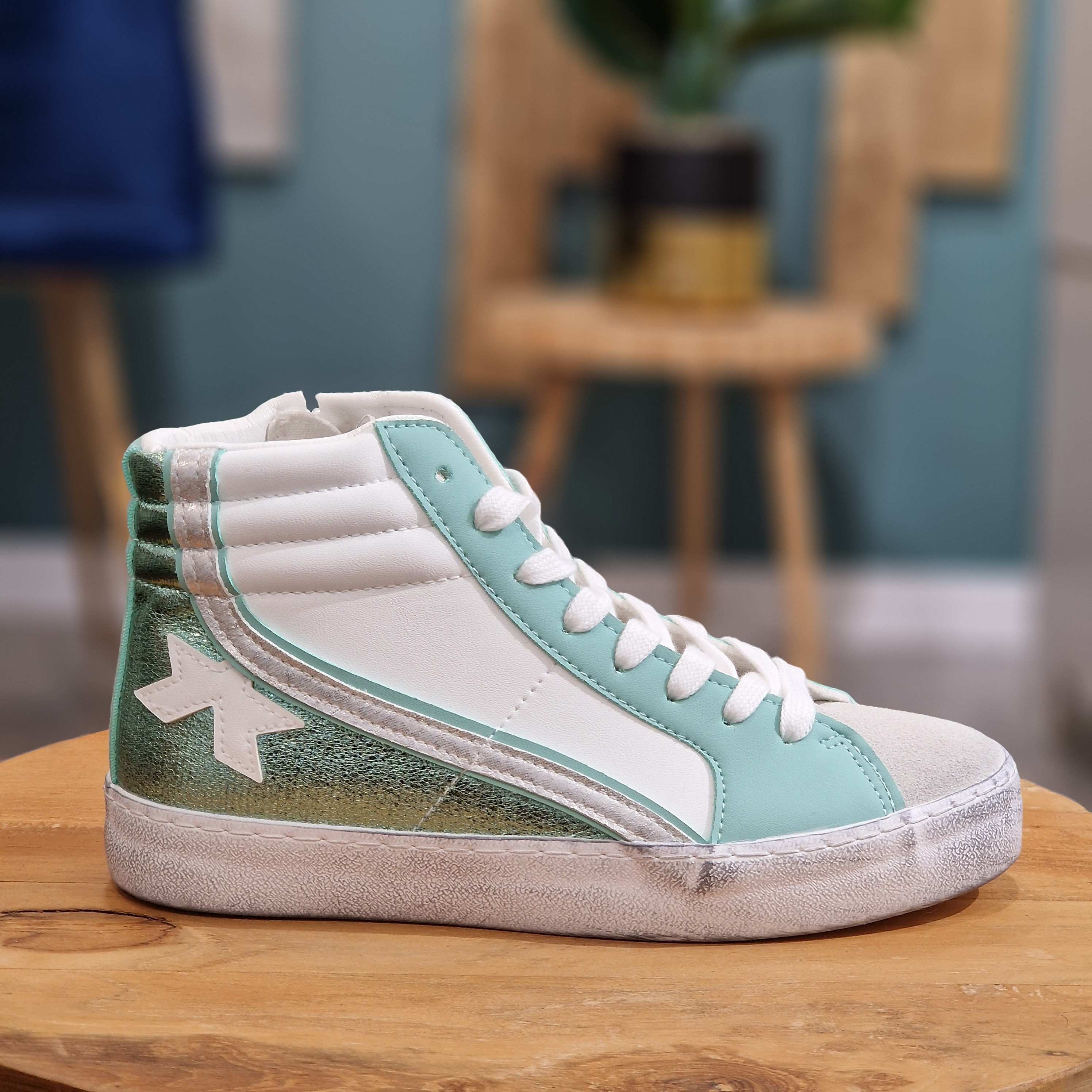 Basket montante blanche, verte, turquoise, argentée. A lacets blancs, fermeture à l'intérieur de la chaussure, semelle aspect vieilli.
