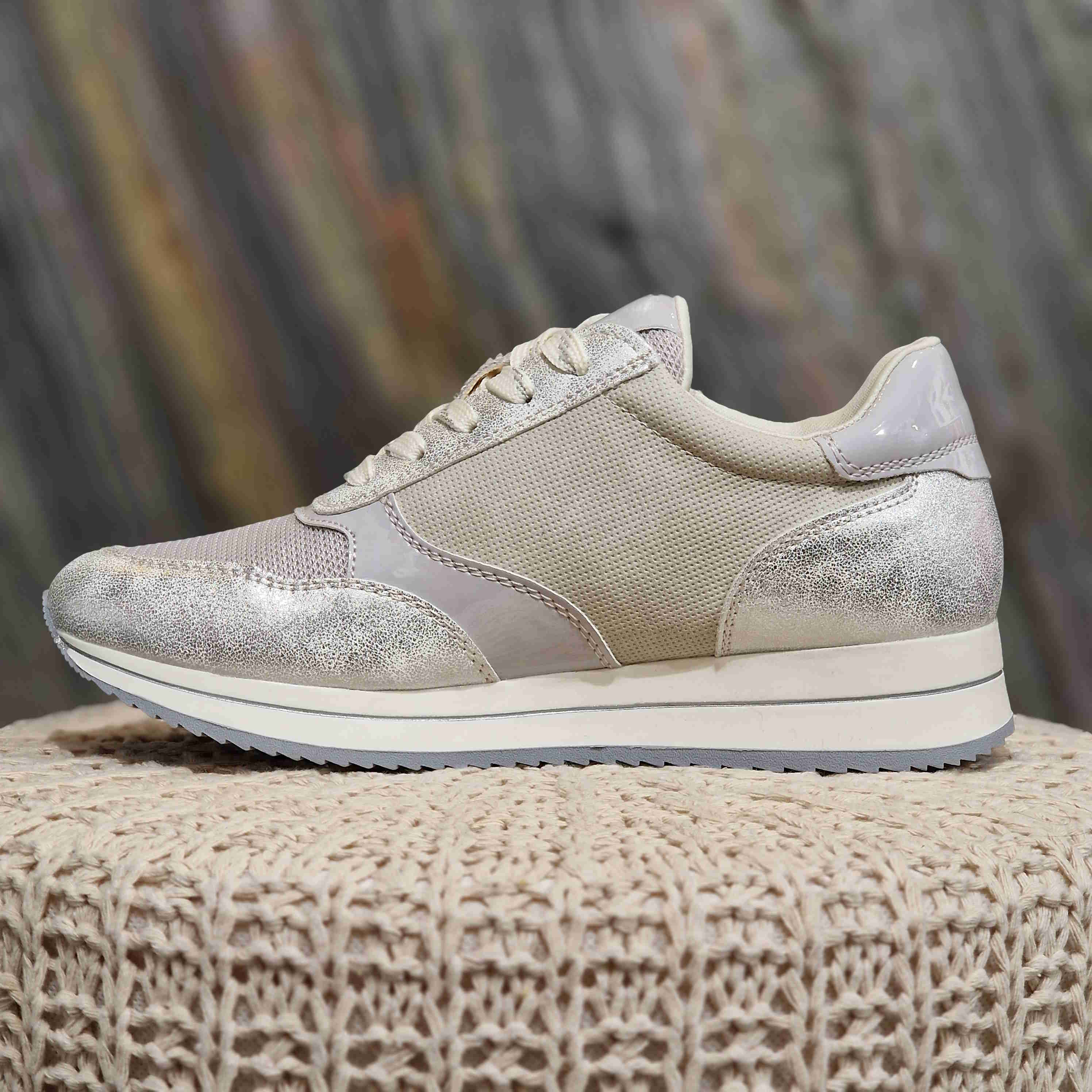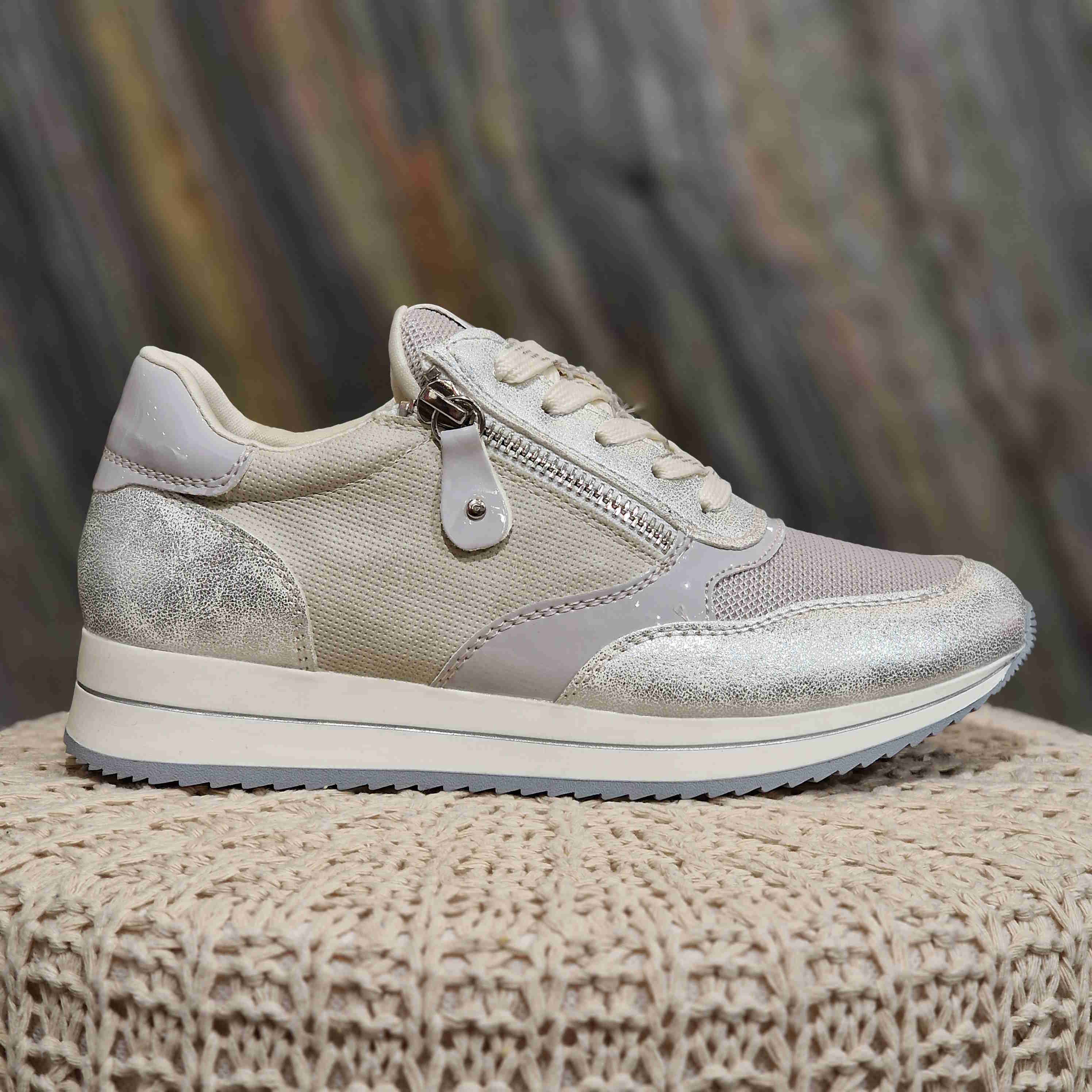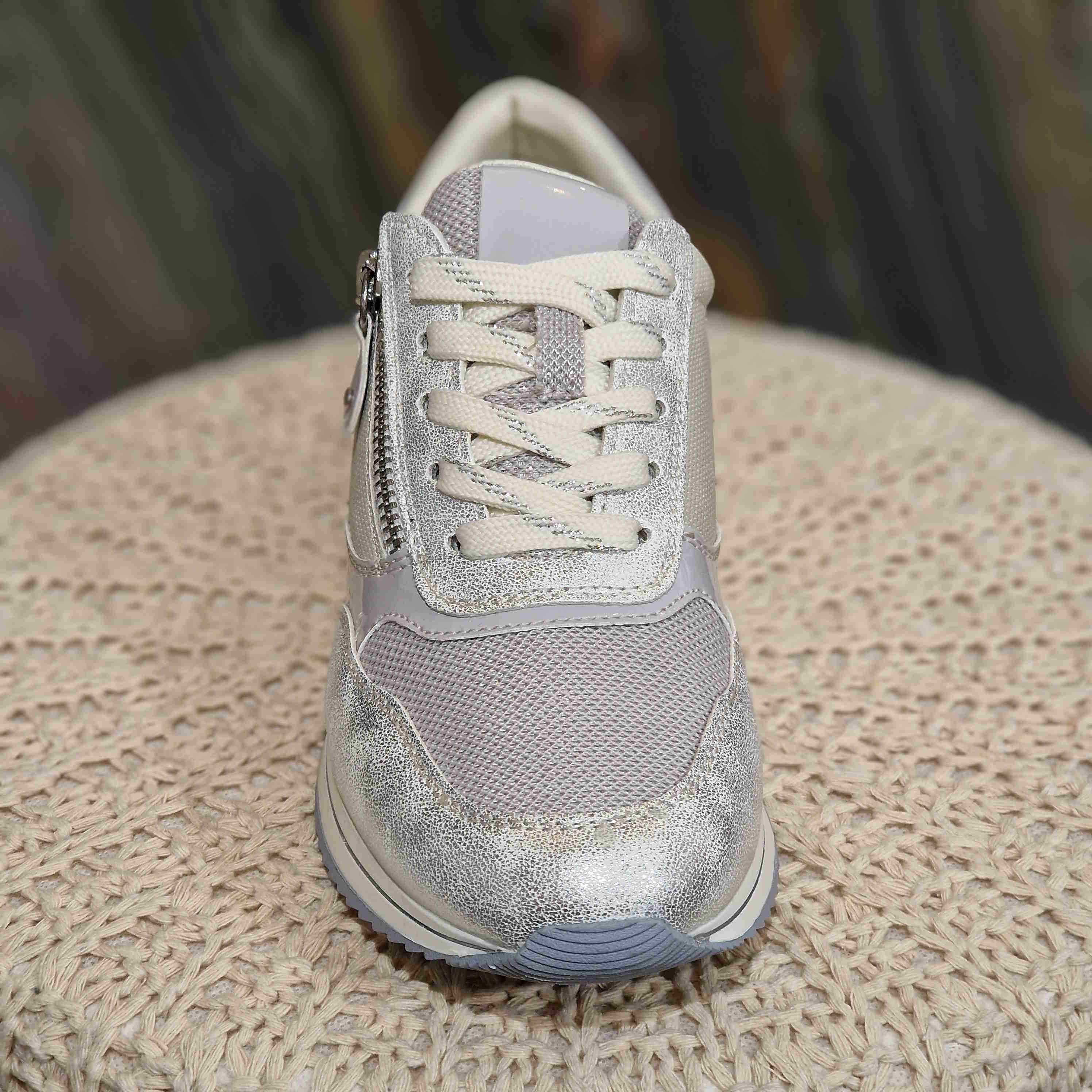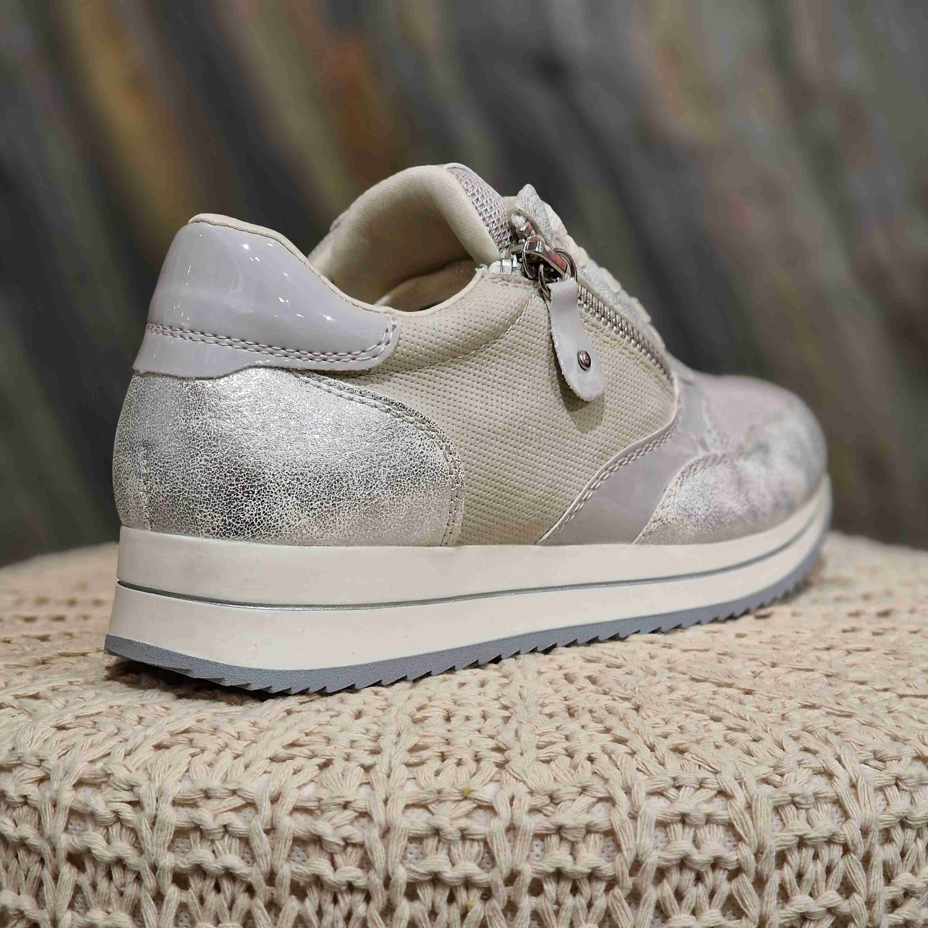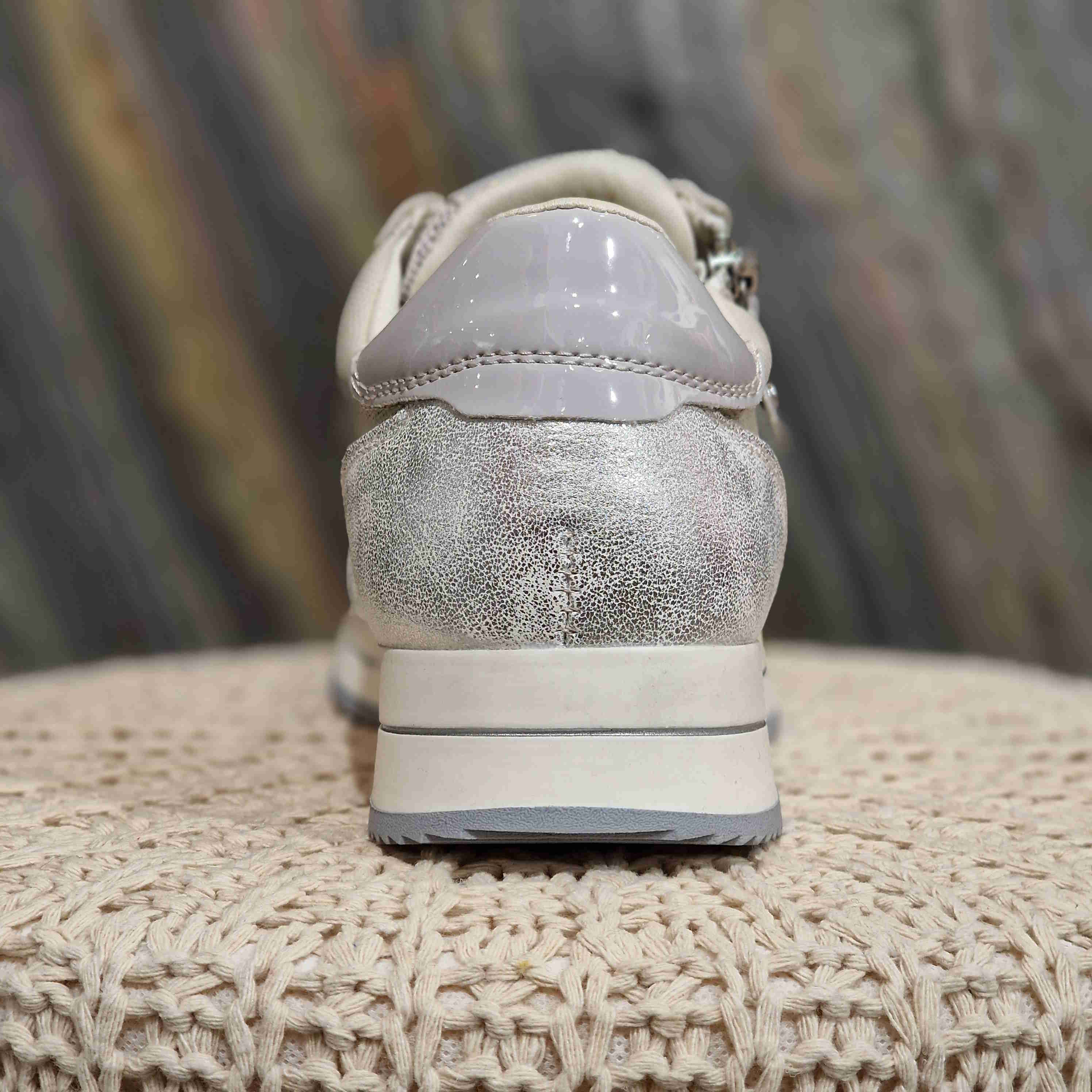Basket semelle softwaves, avec fermeture sur l'extérieur de la chaussure. Elle a un camaïeu de gris, argenté, blanc et beige ainsi que plusieurs matières.