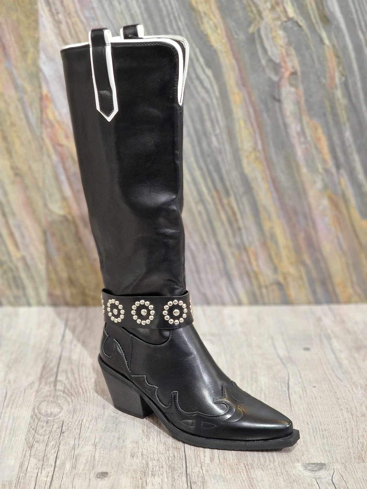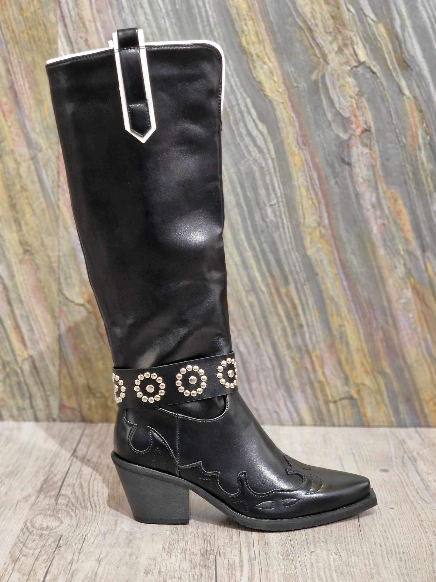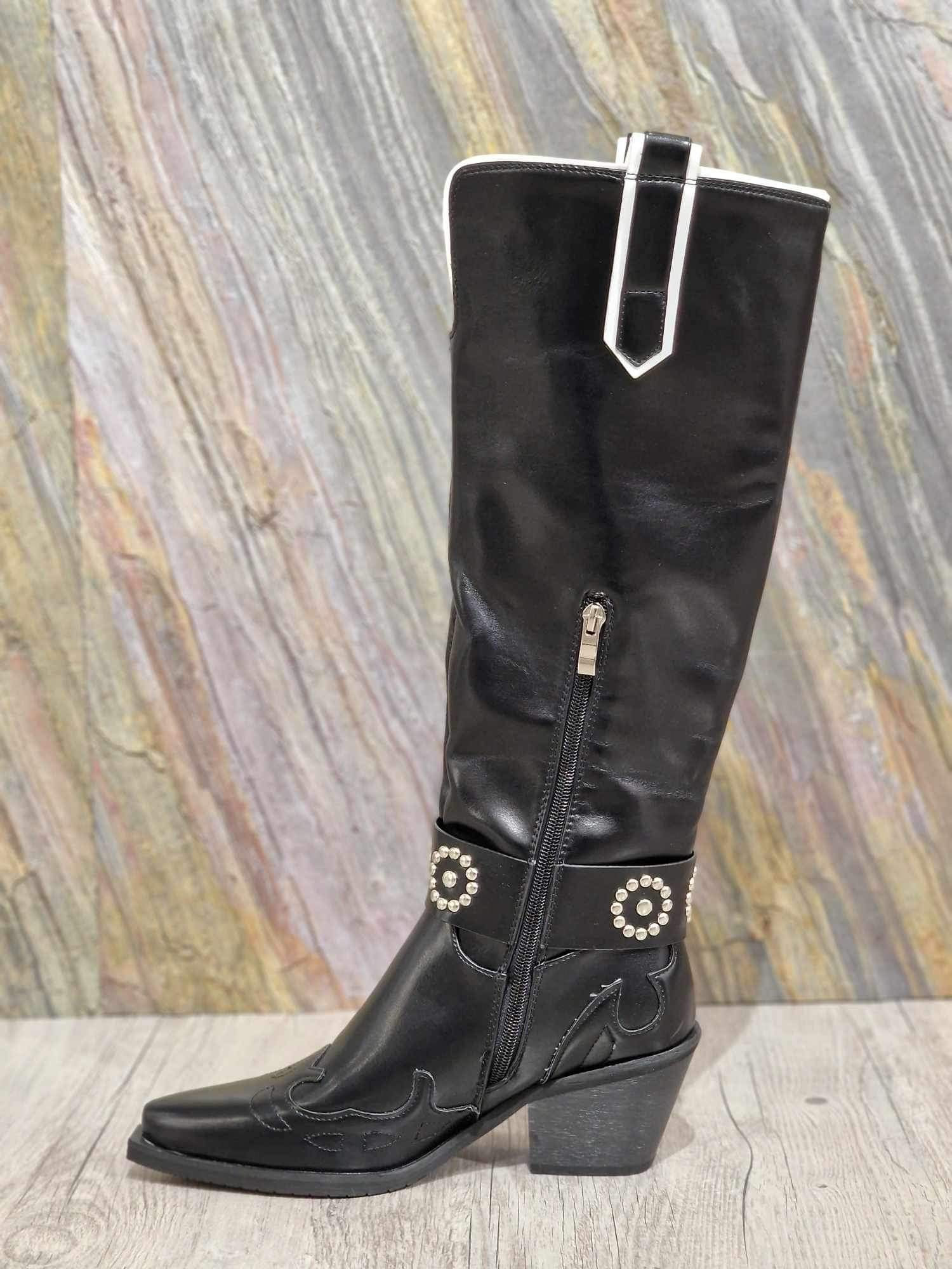 Botte à talon noire en similicuir. Avec découpe et biais blancs sur le haut de la chaussure. Il y a également un empiècement avec des clous argentés. Fermeture intérieur pour l'emboitage. Très confort grâce au talon de 4 cm à 6,5 cm.