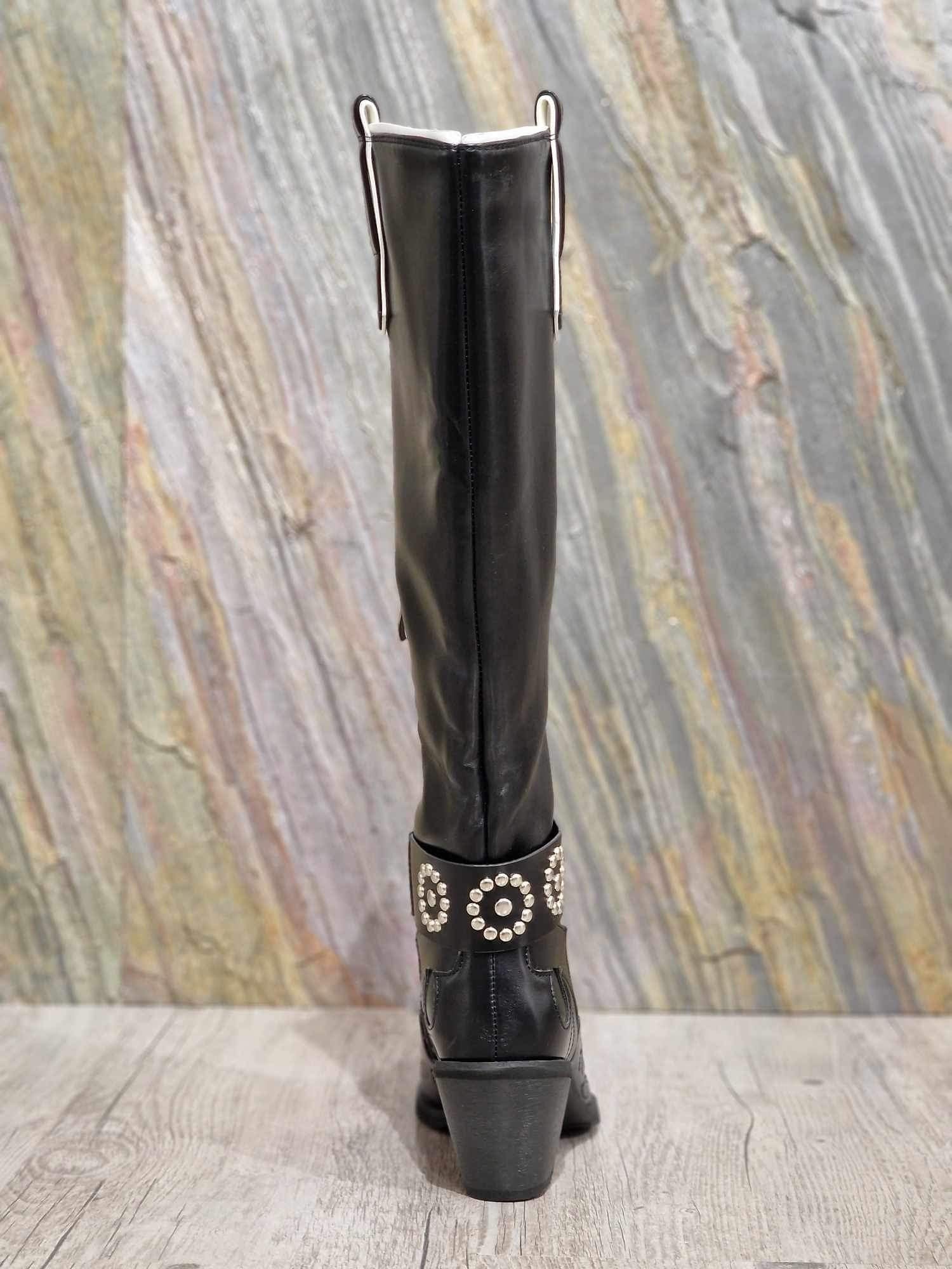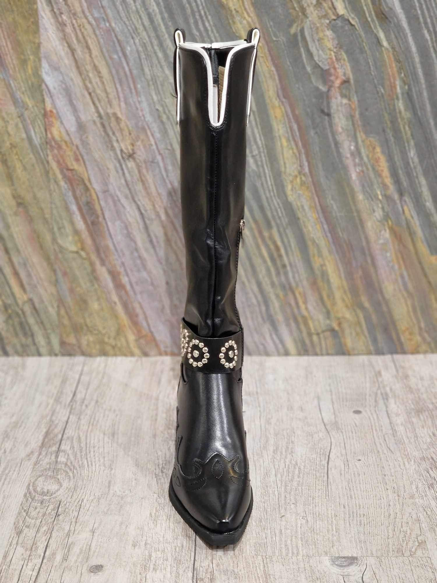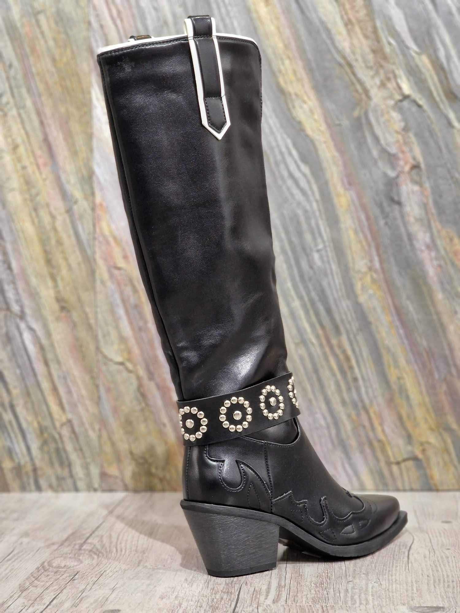 Botte à talon noire en similicuir. Avec découpe et biais blancs sur le haut de la chaussure. Il y a également un empiècement avec des clous argentés. Fermeture intérieur pour l'emboitage. Très confort grâce au talon de 4 cm à 6,5 cm.