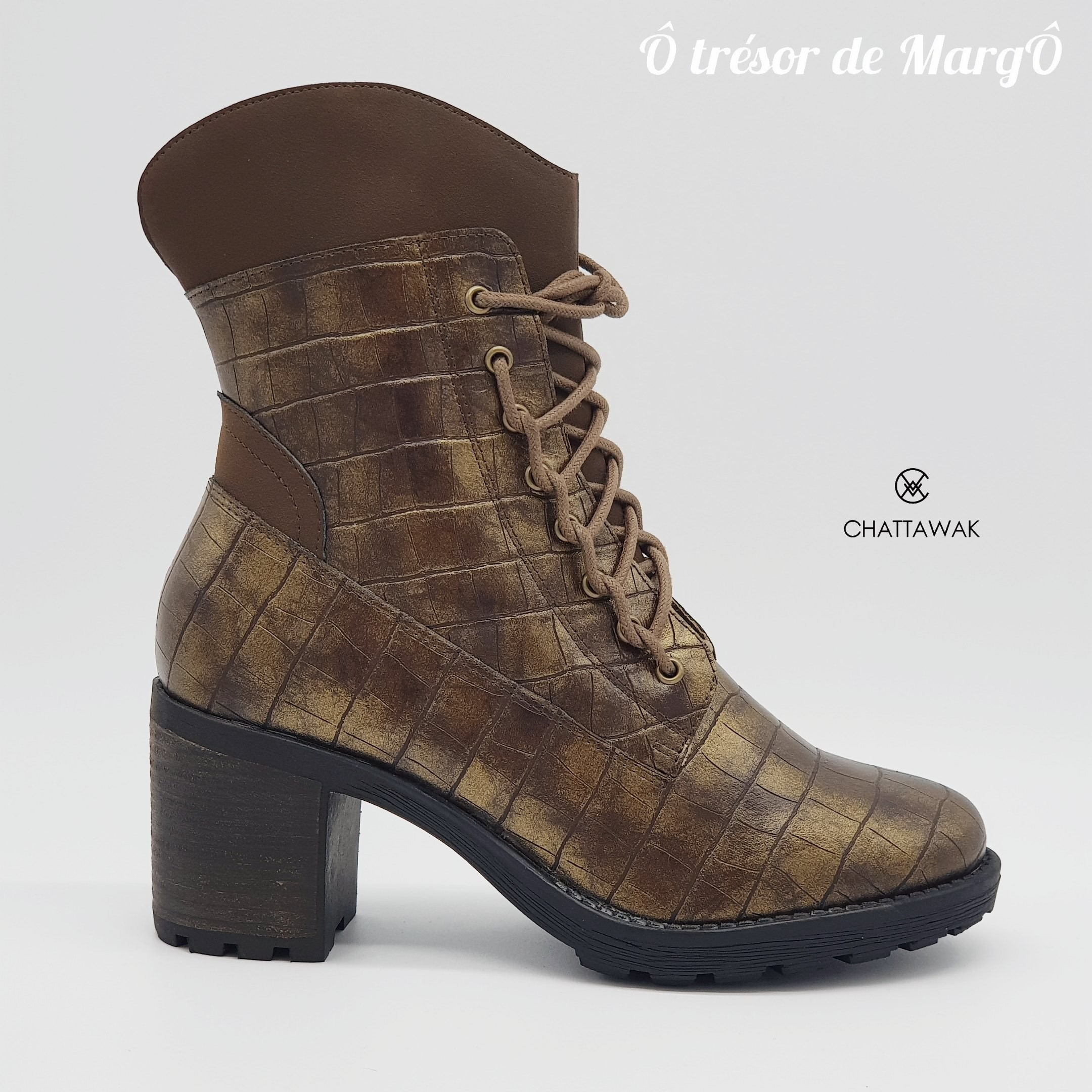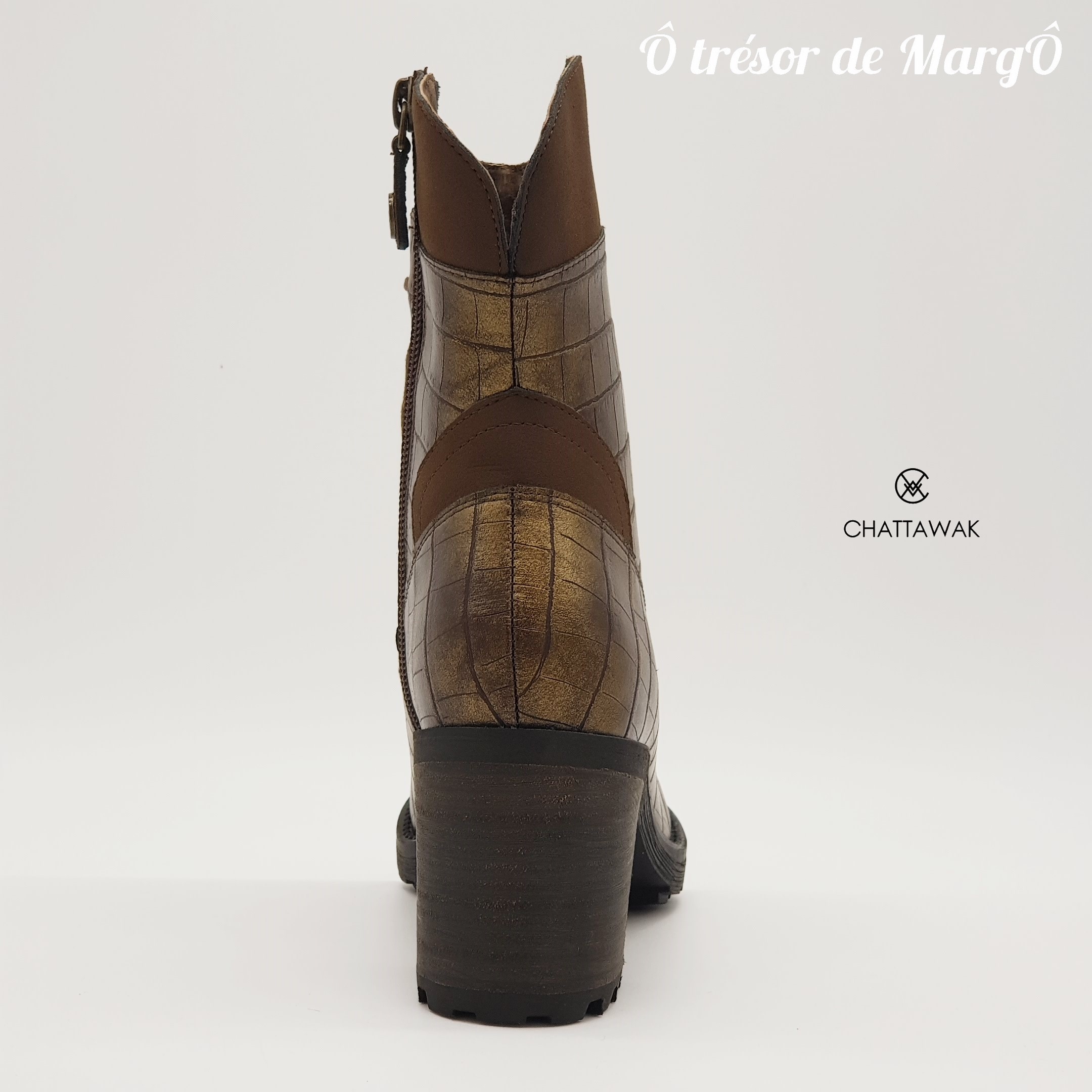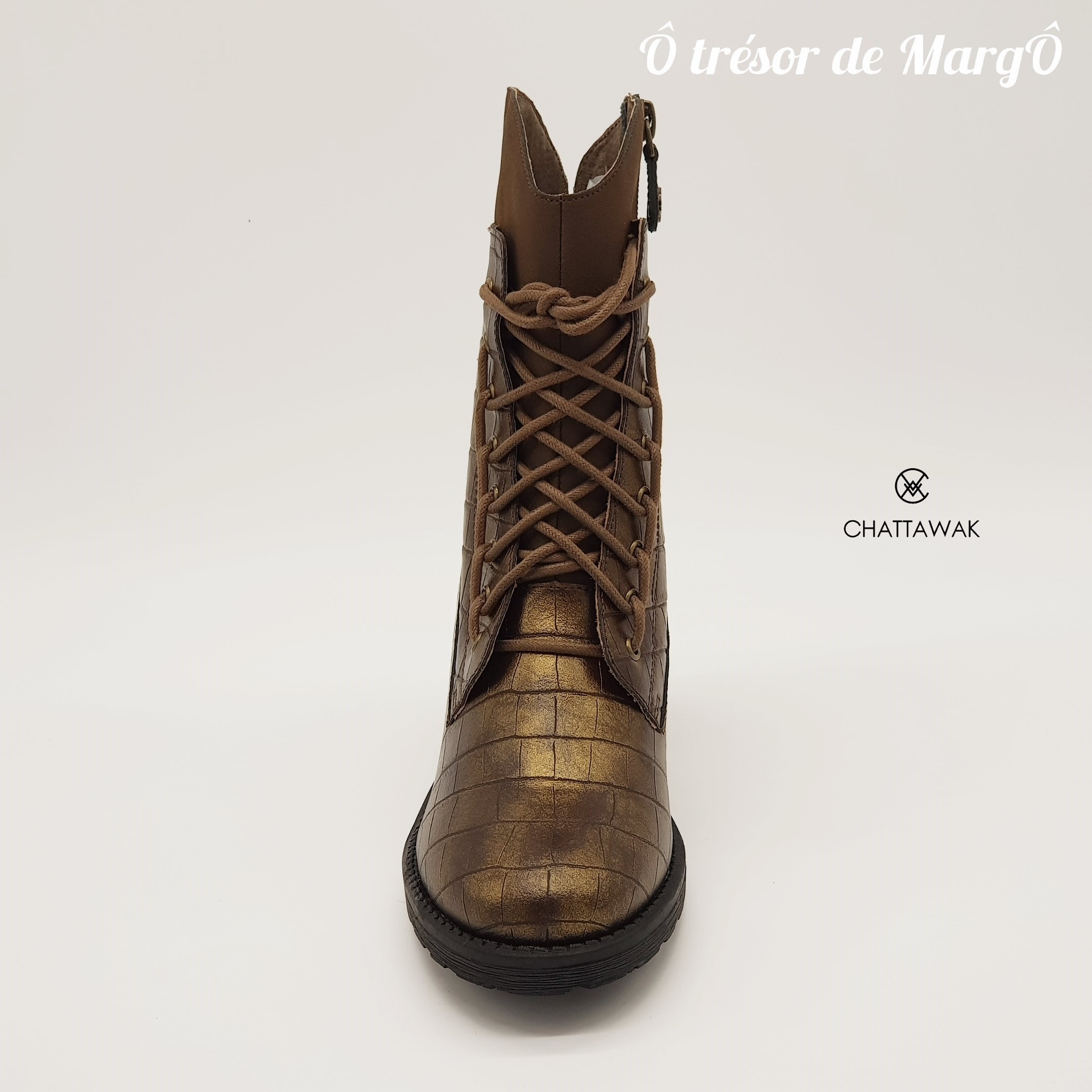 Bottine en cuir à talon et lacets, coloris chocolat patinée or, en cuir aspect croco, de chez CHATTAWAK