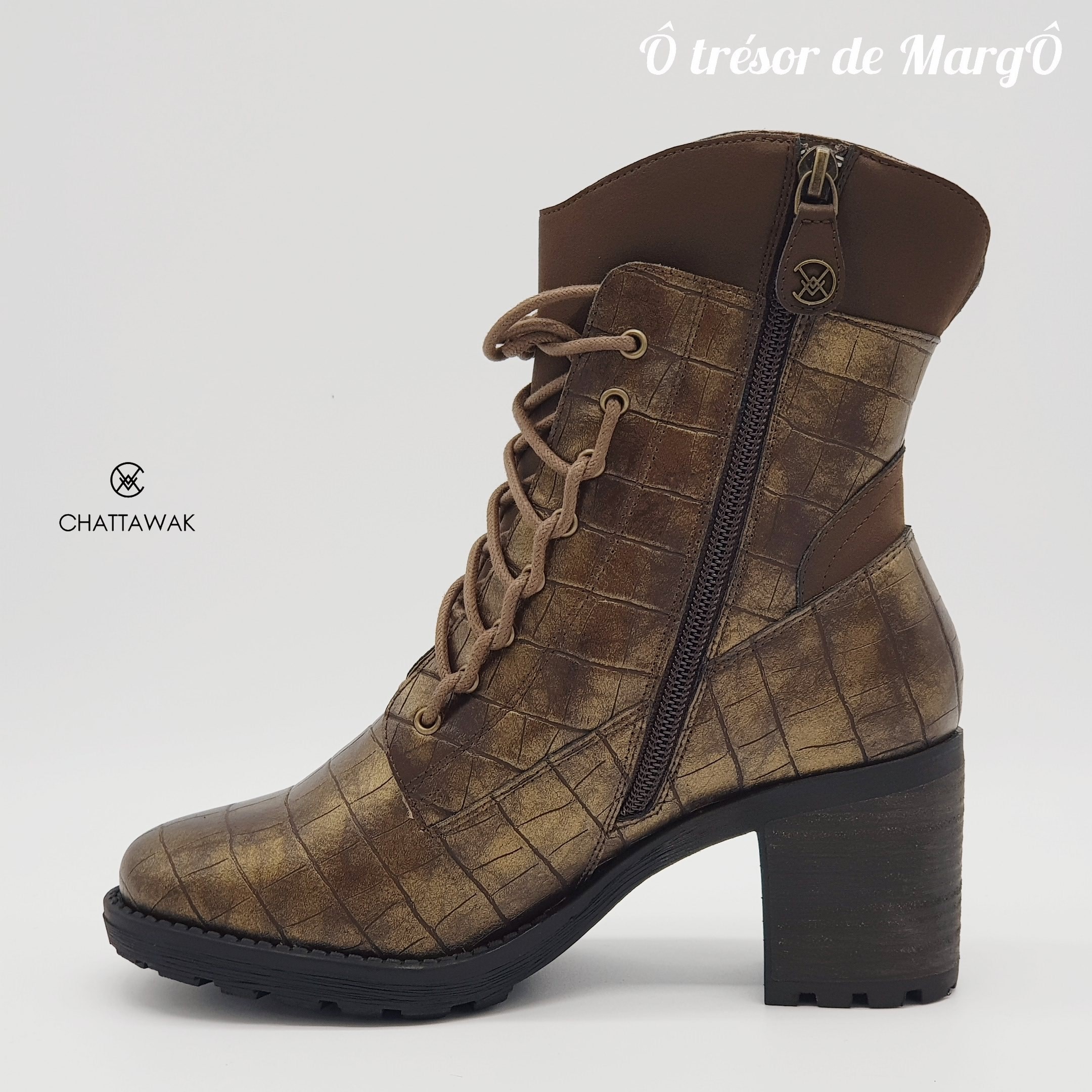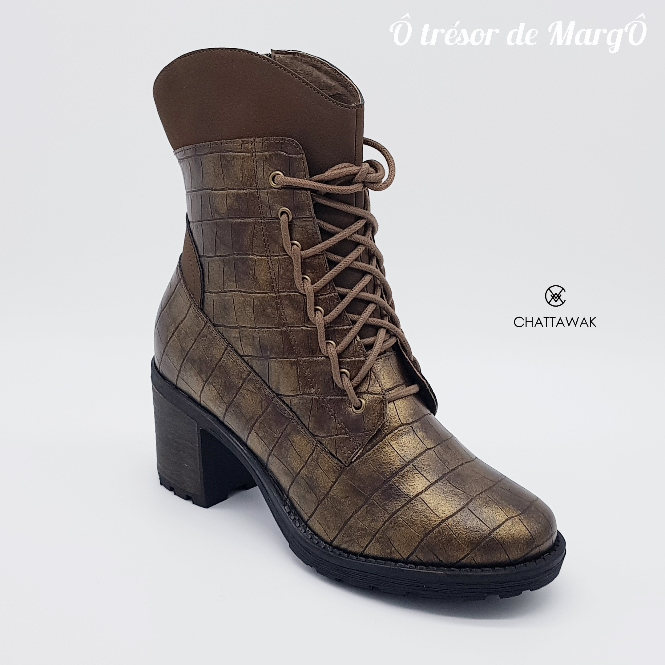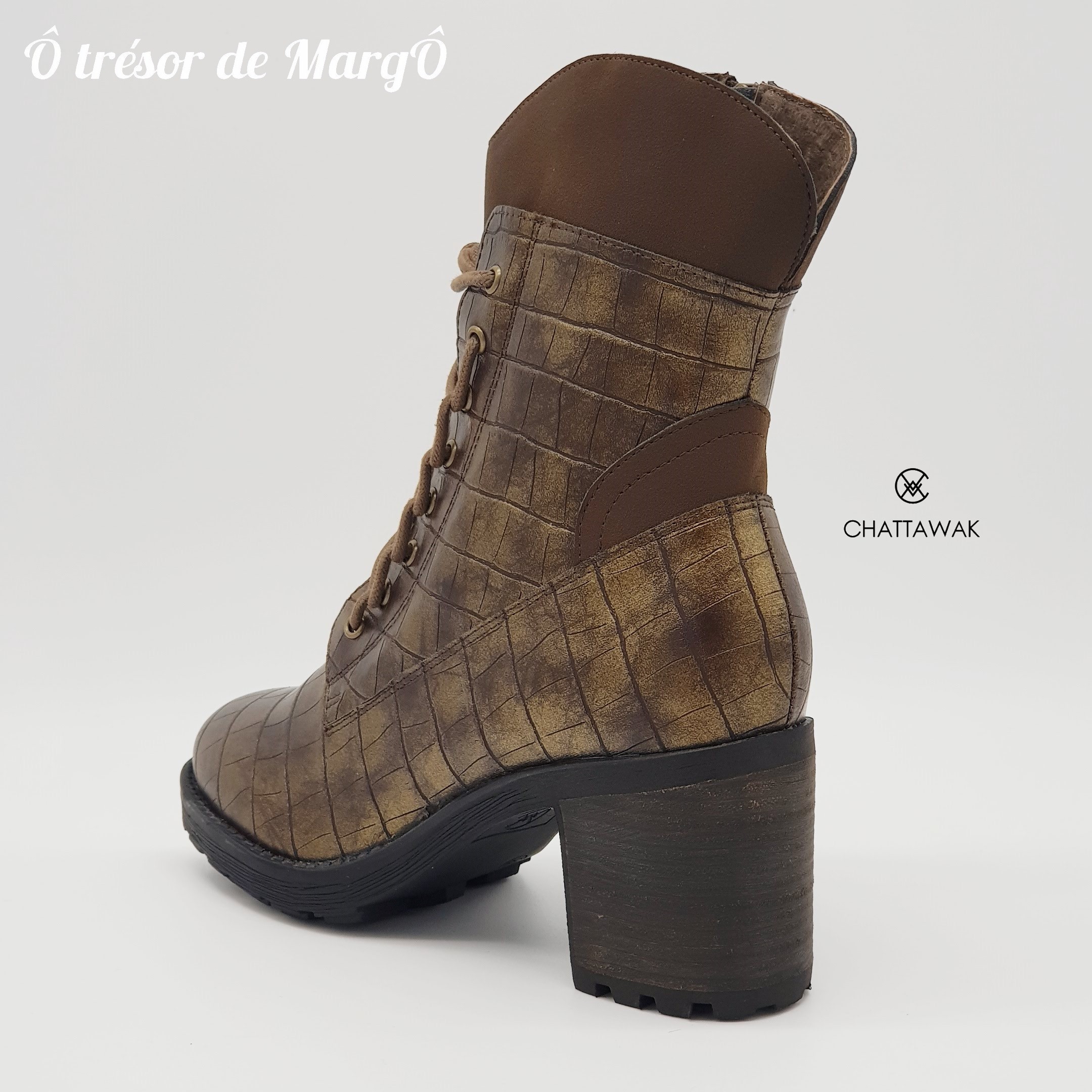 Bottine en cuir à talon et lacets, coloris chocolat patinée or, en cuir aspect croco, de chez CHATTAWAK