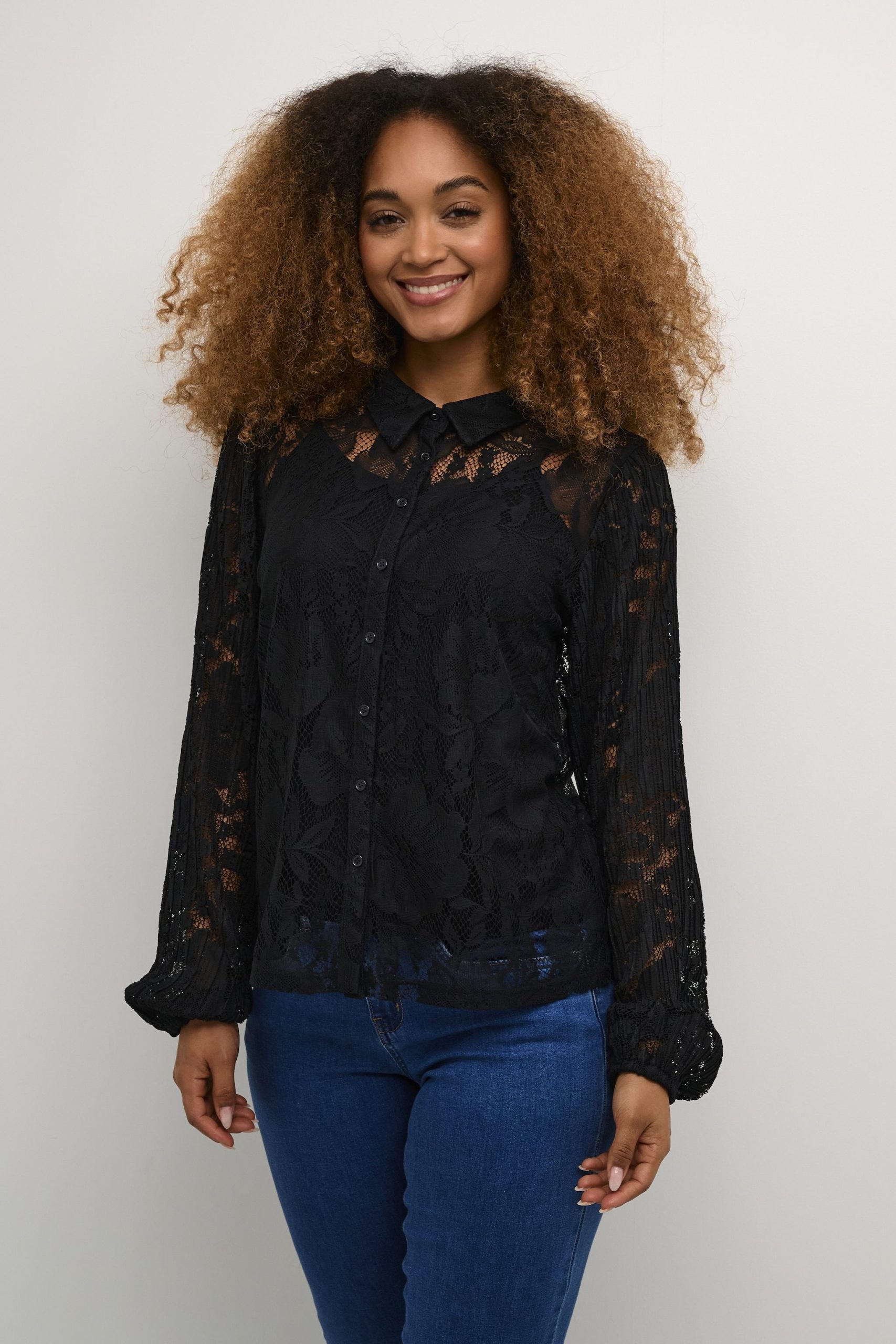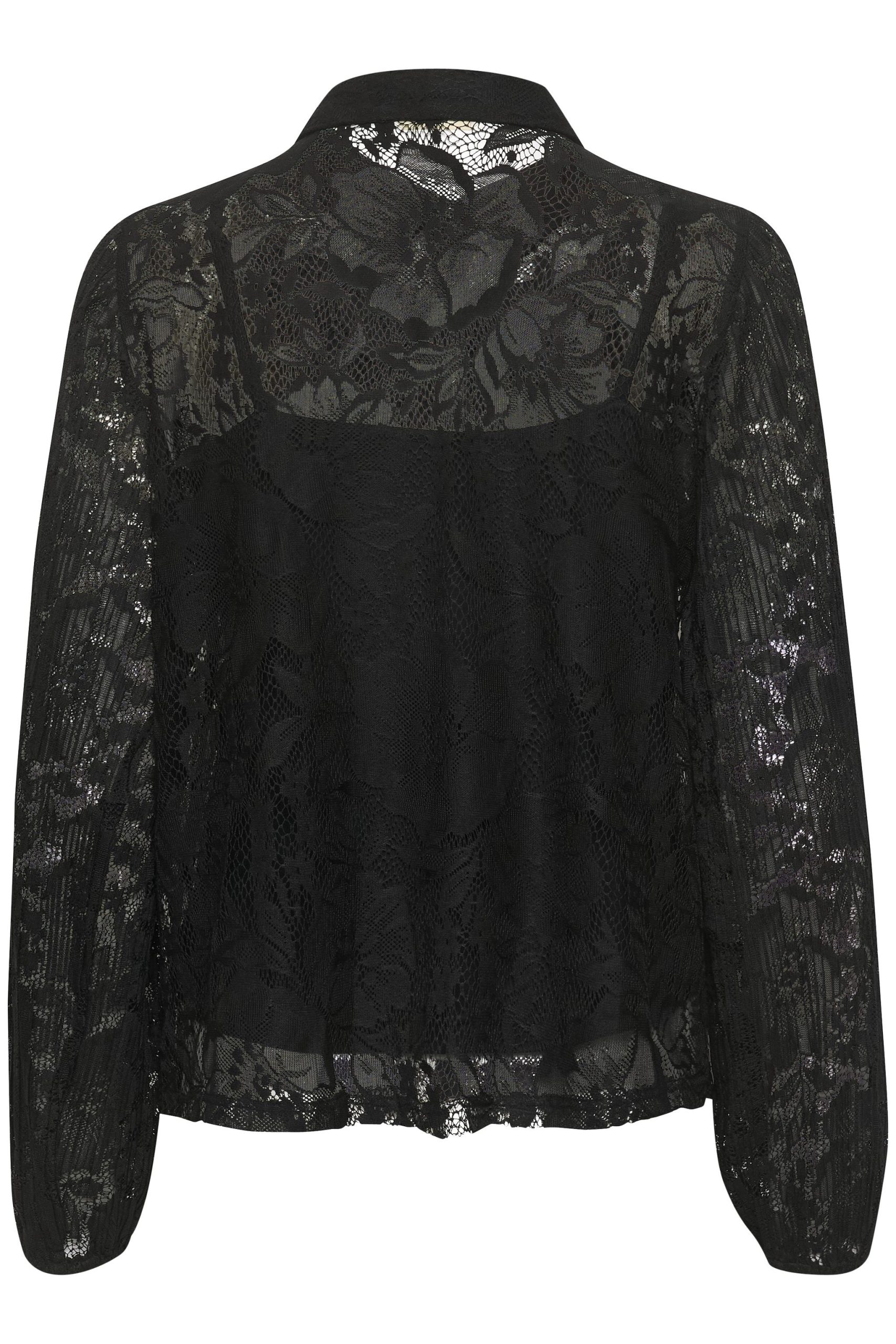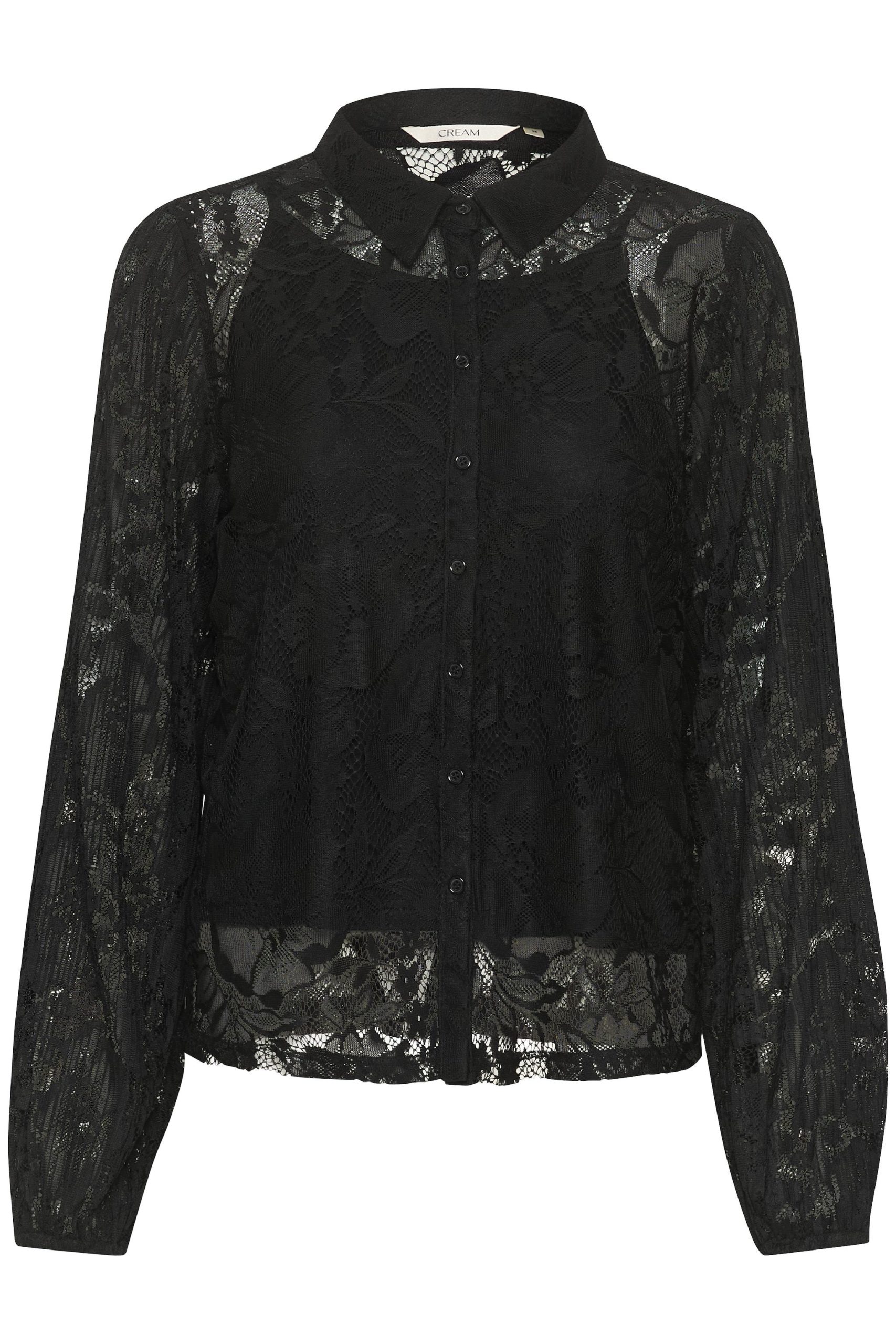 Cette chemise noire, en dentelle, avec sa doublure de la marque Cream est travaillée et très élégante. D'une coupe droite, qui descend jusque sur la hanche, elle offre un style facile à combiner. Elle a des manches longues travaillées, avec un élastique en bas. Elle allie qualité et praticité.