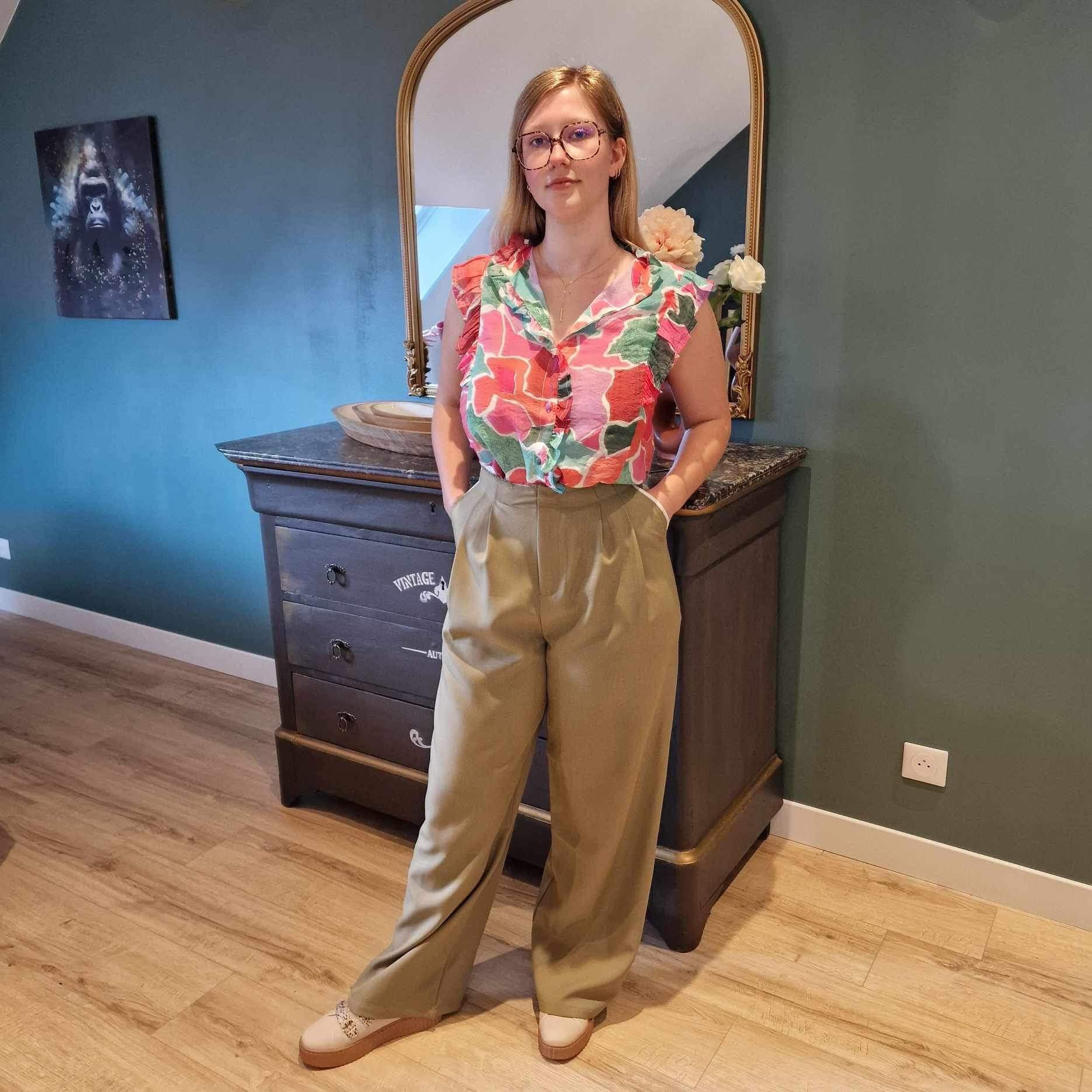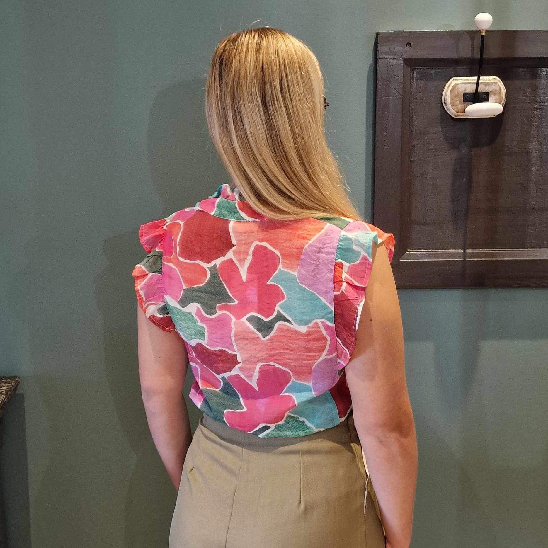 Chemisier sur fond blanc imprimé coloré, rose, kaki et lilas. Avec patte de boutonnage tout le long et froufrous en finitions, sans manches avec froufrous par dessus.