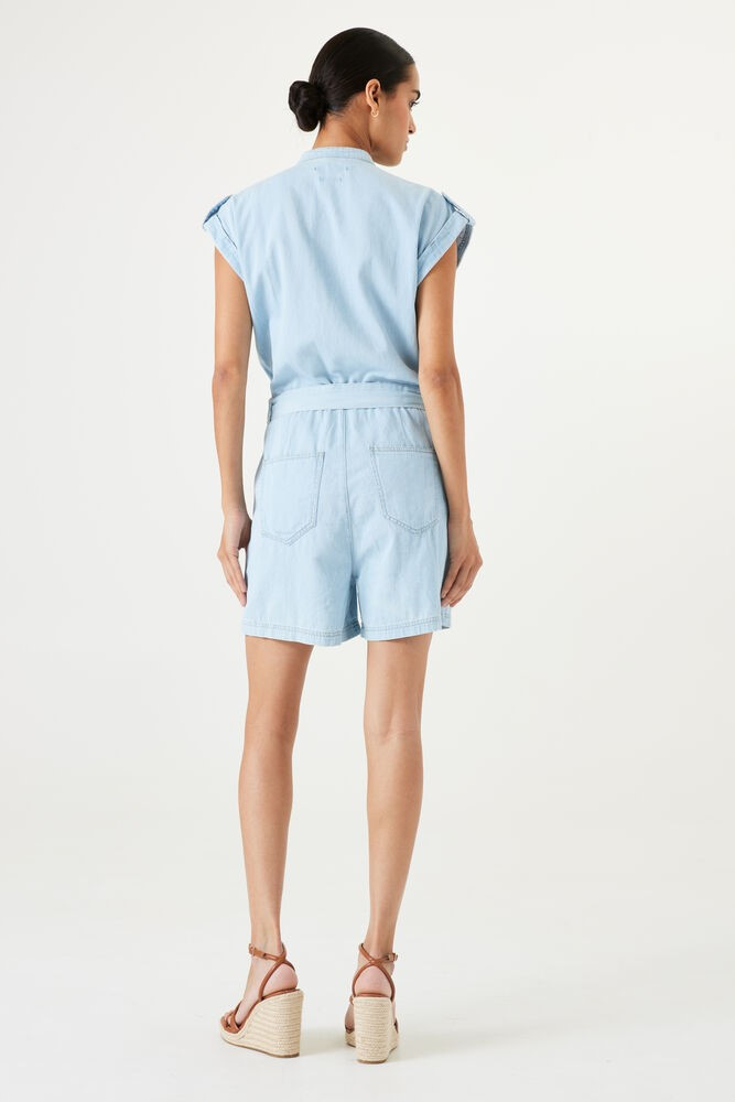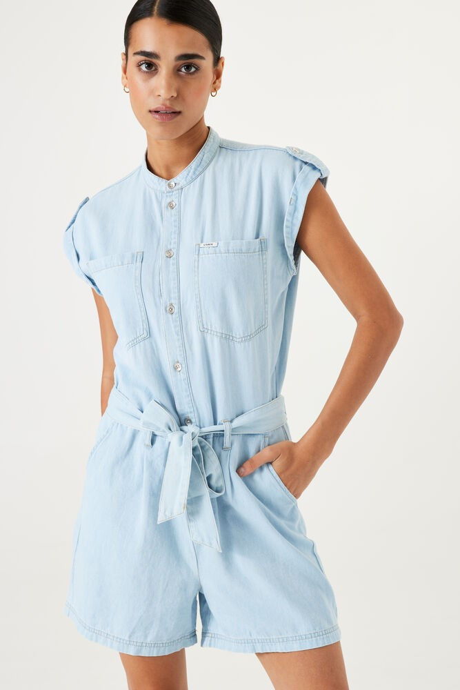 Combishort en denim avec poches poitrine. Un incontournable pour cette saison. Cette combishort a des poches latérales, un col officier, une fermeture à bouton avec une ceinture à la taille et une coupe régulière. Cet article est composé à 100% de coton.