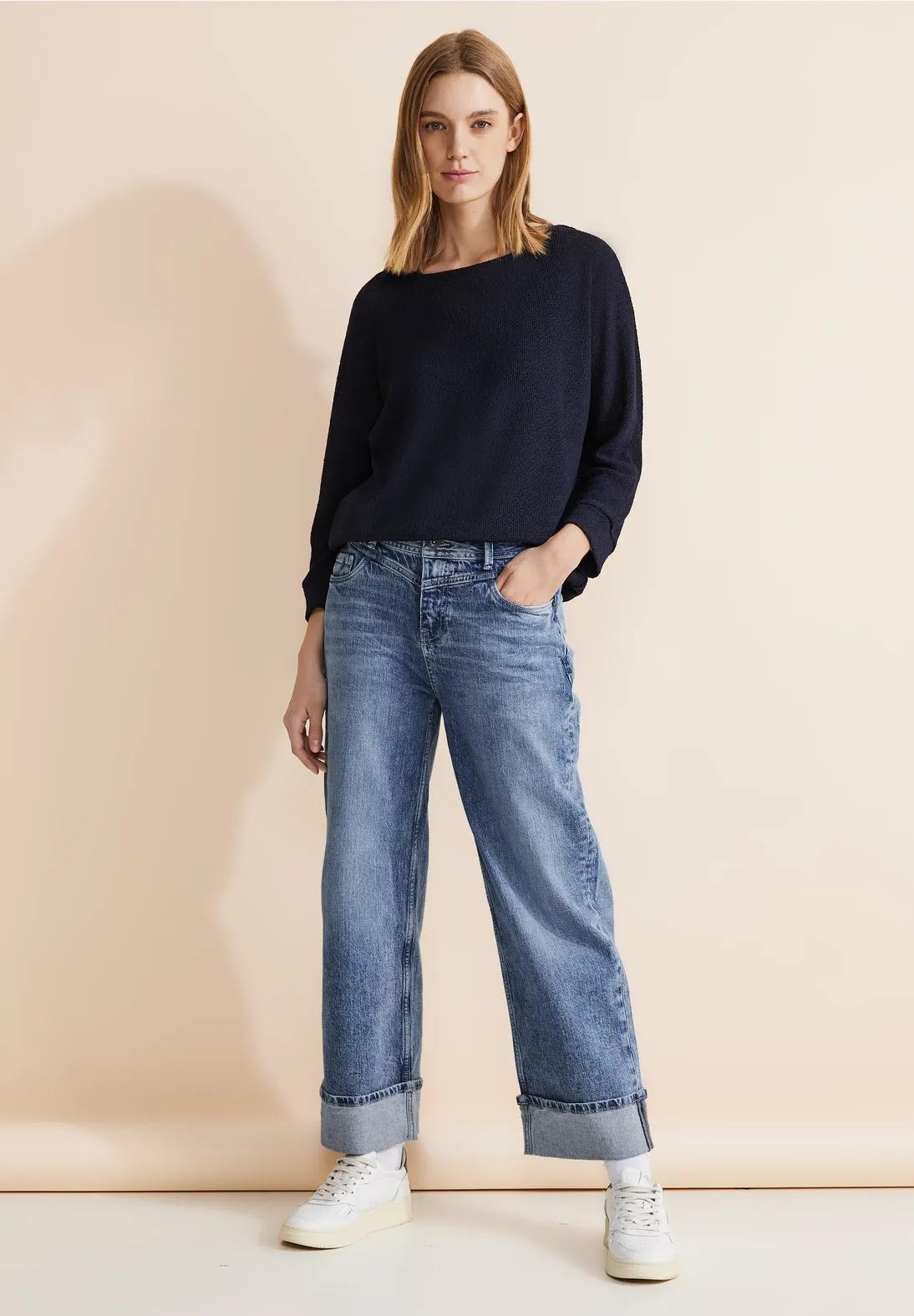 Ce jean femmes de Street One séduit avec sa coupe classique à taille haute et jambes droites. Ce jean vous offre un look boyfriend décontracté au délavage bleu clair frais. Avec son design décontracté, c'est le choix idéal pour apporter une note à la fois décontractée et élégante à votre look.