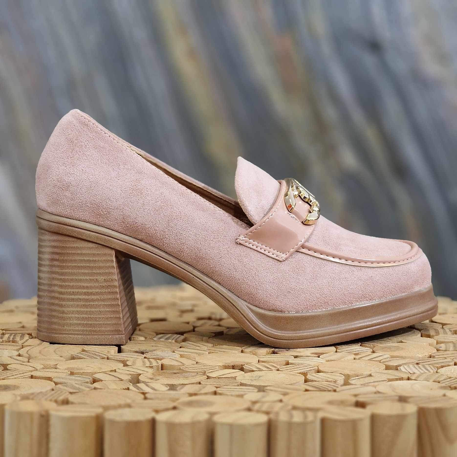 Mocassin à talon rose avec finition en vernis rose. Avec bijou doré sur le devant de la chaussure. Avec plateforme de 2cm et à talon carré de 6,5cm.