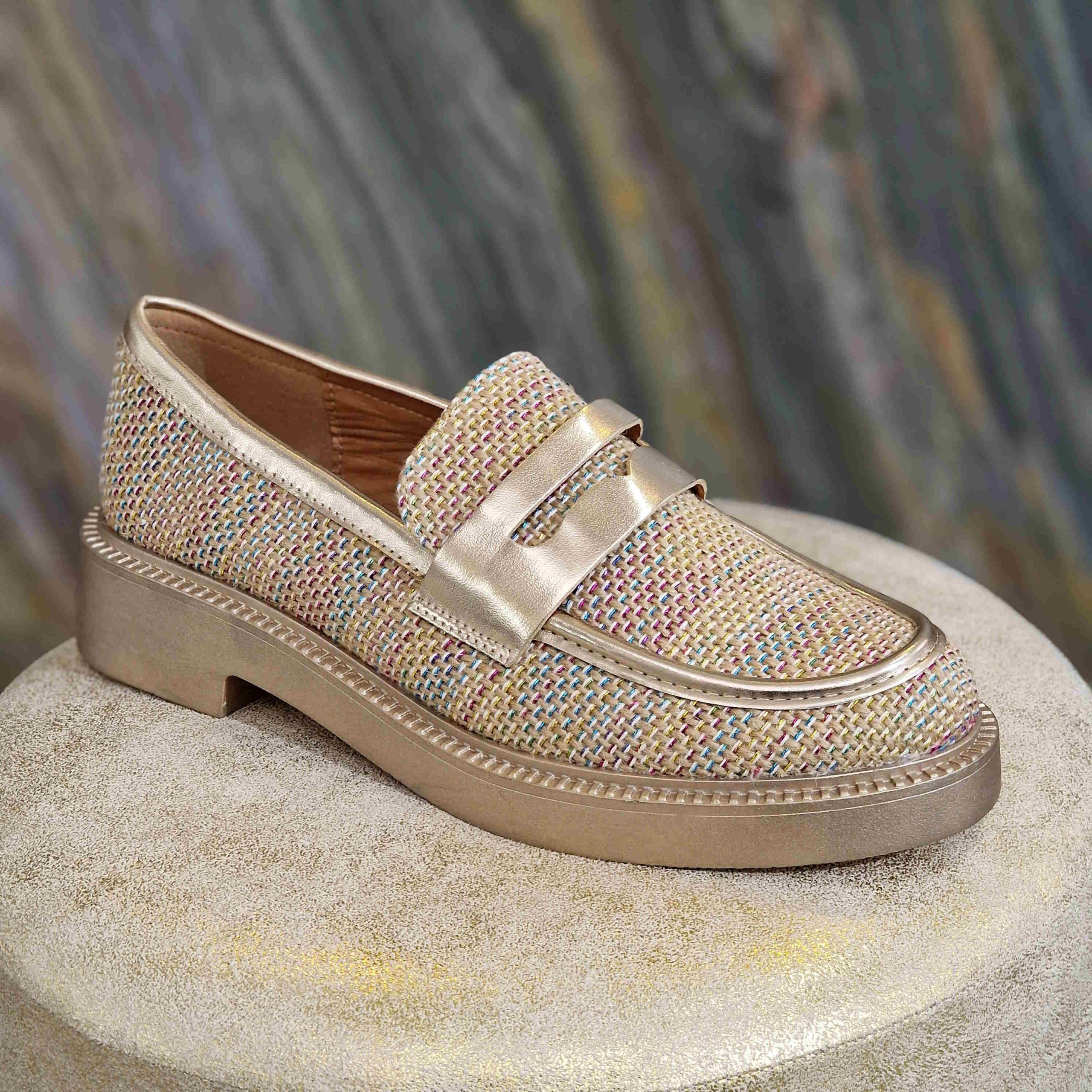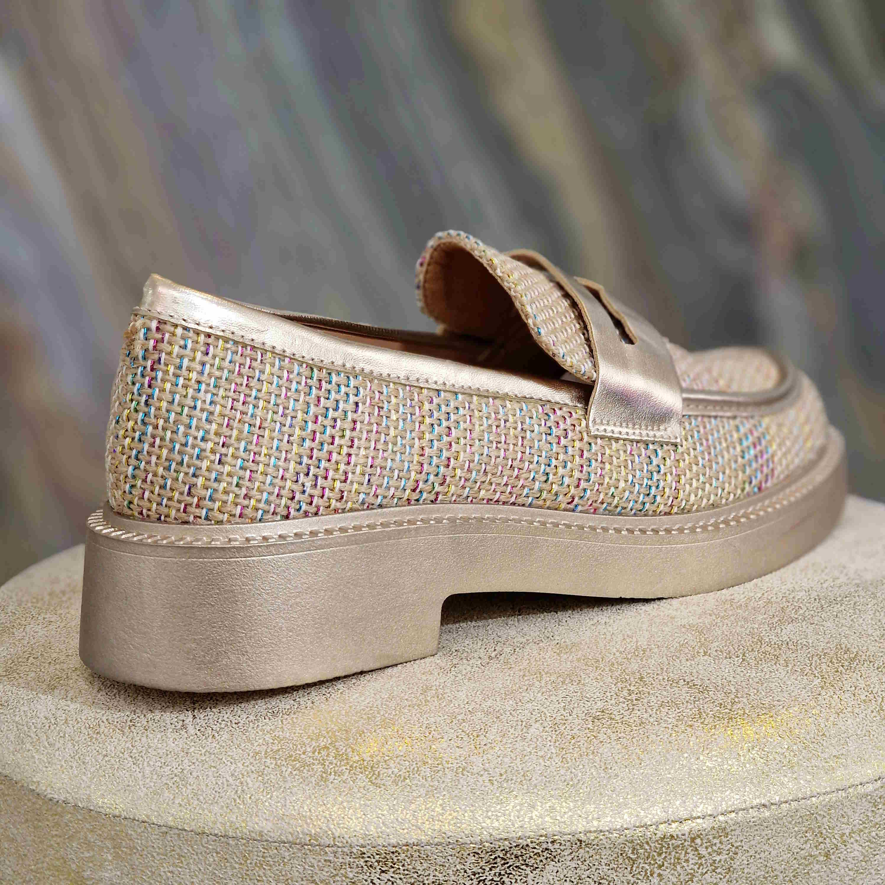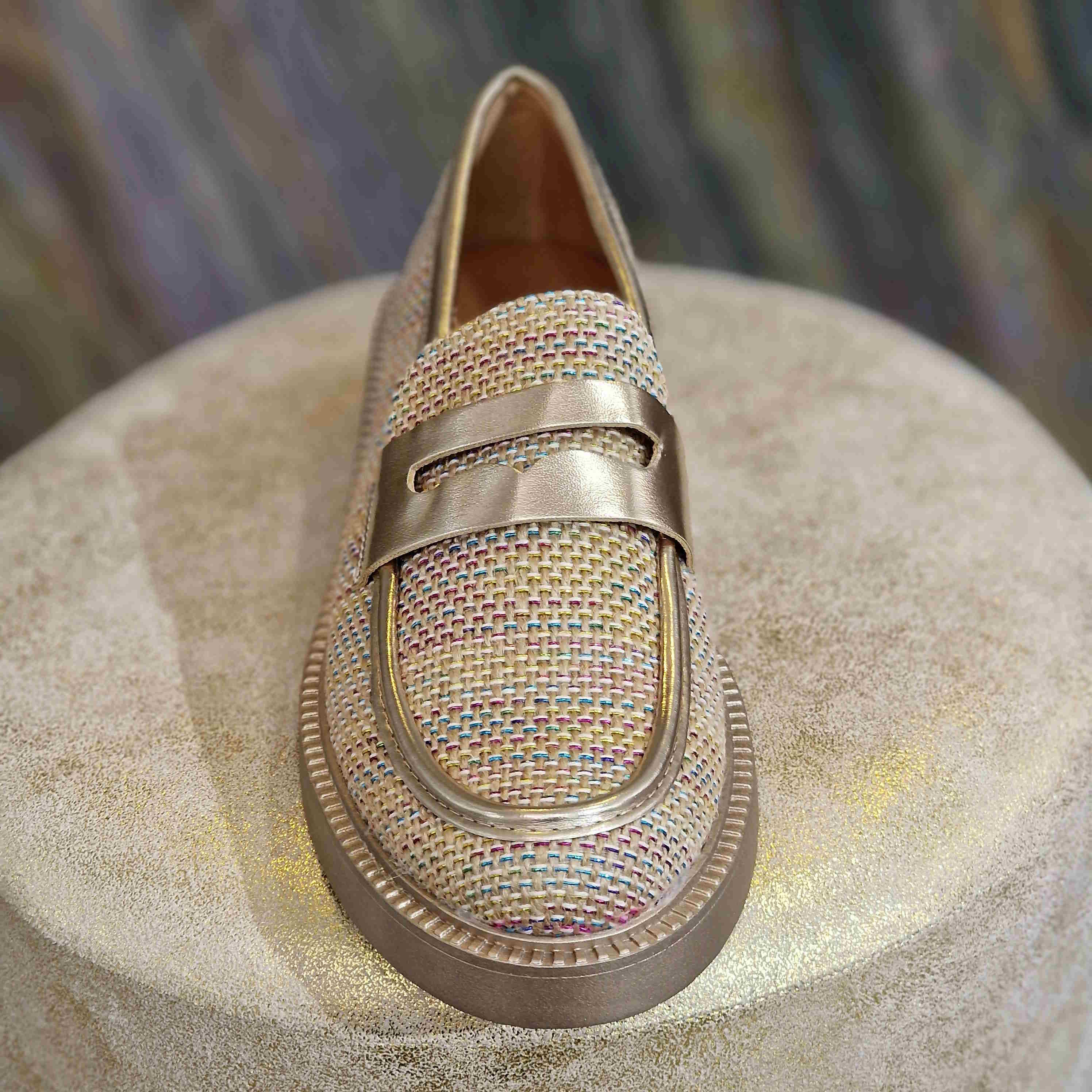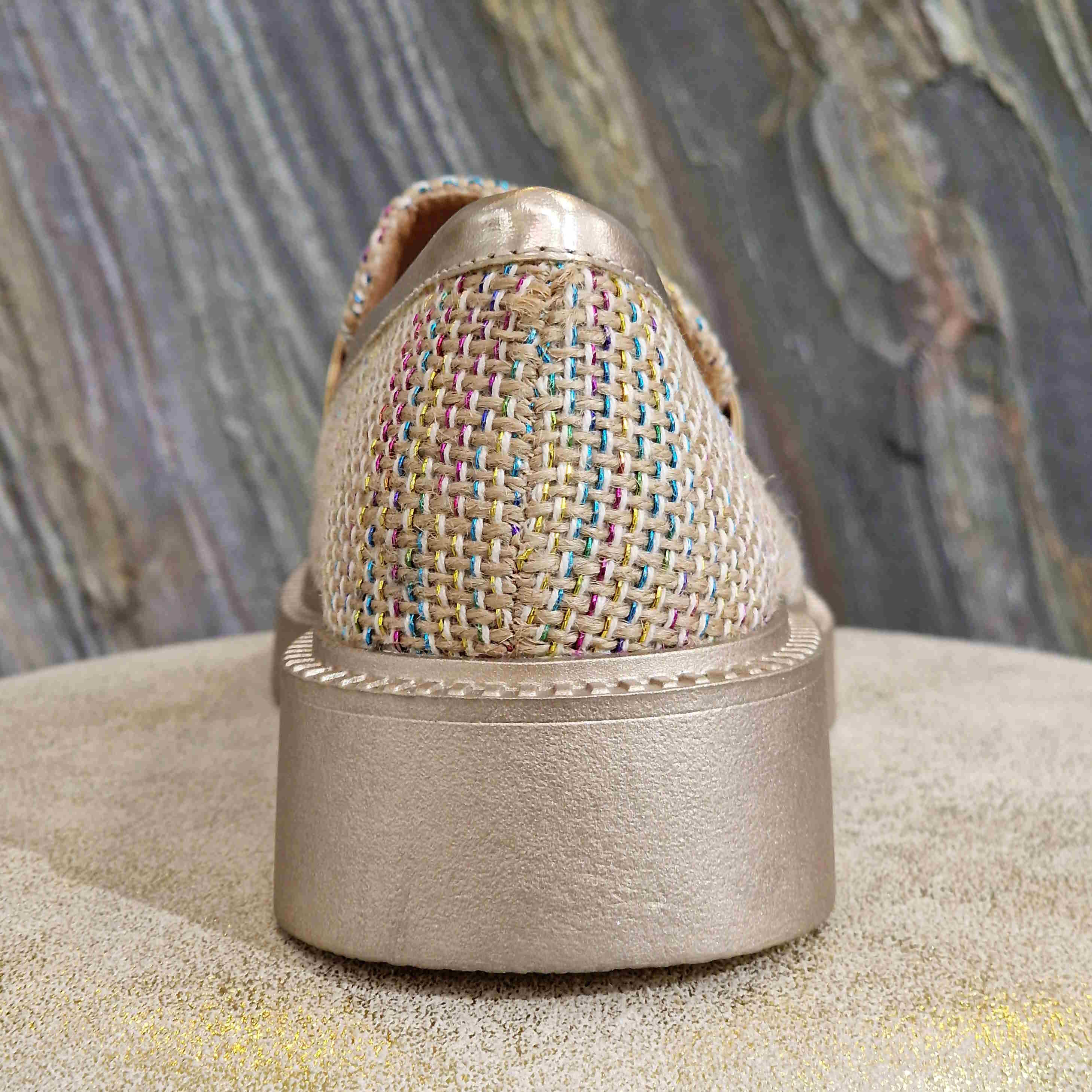 Mocassin tissé multicolore à semelles couleur doré champagne, avec bride champagne assorti sur le haut de la chaussure.