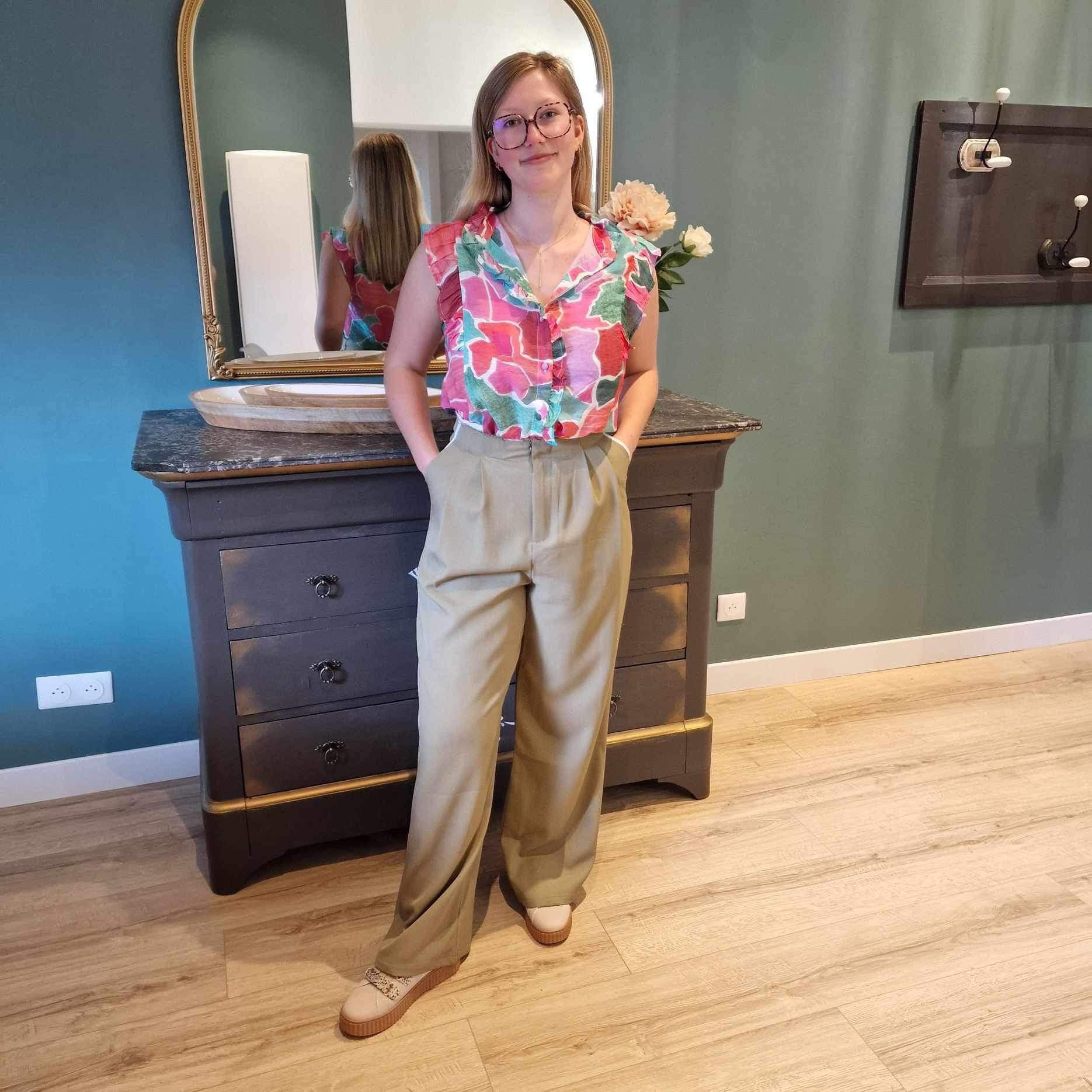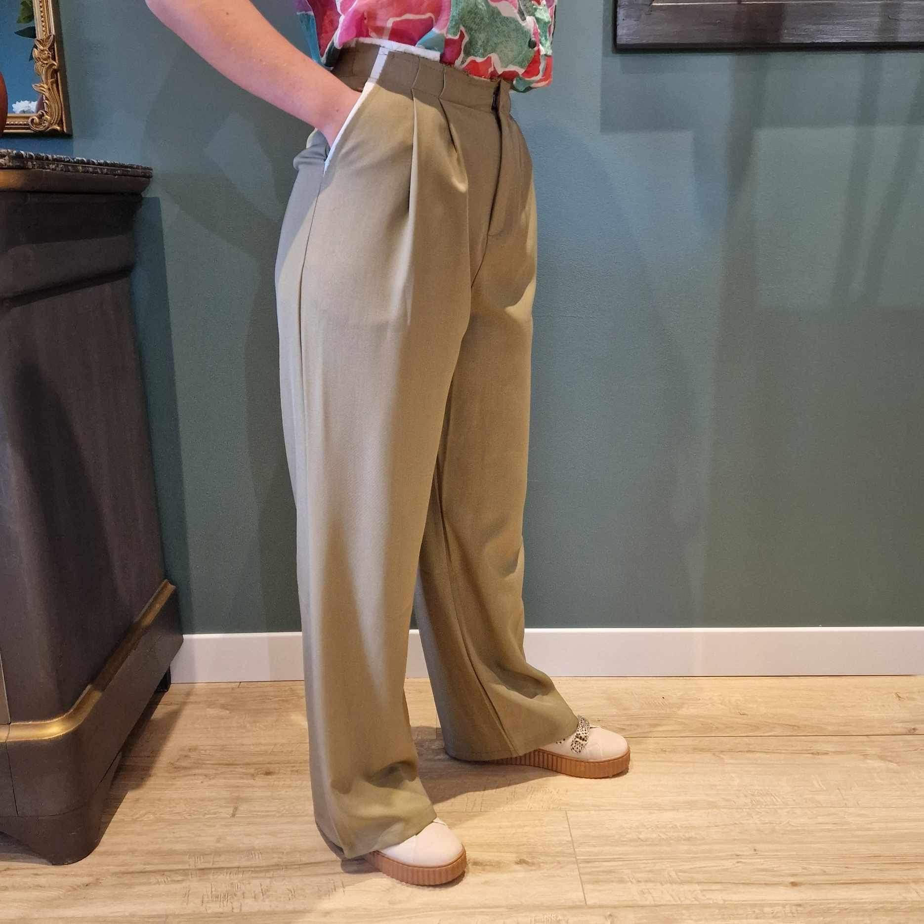 Pantalon large, fluide à pinces kaki. Avec rebords blancs coupés à cru. Taille haute avec poches à l'italienne.