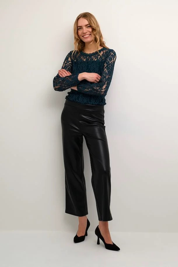 Ce pantalon 7/8ème en simili cuir, a une coupe droite qui par légèrement en évasé sur le bas, élastiqué à la taille. Que se soit avec une blouse, une chemise, un pull pour un look chic décontracté, ou une veste, un blazer pour un look chic vous le mettrez avec n'importe quoi ce pantalon ce charge de tout !