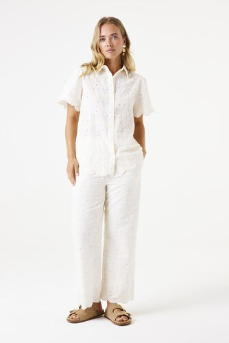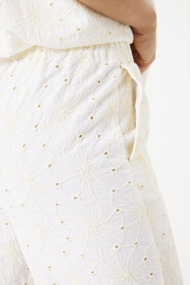 Pantalon court avec broderie anglaise. Un article comme celui-ci a sa place dans la garde-robe de chaque femme ! Ce pantalon a une taille moyenne, une taille élastique et une coupe décontractée. Cet article est composé à 100 % de coton.