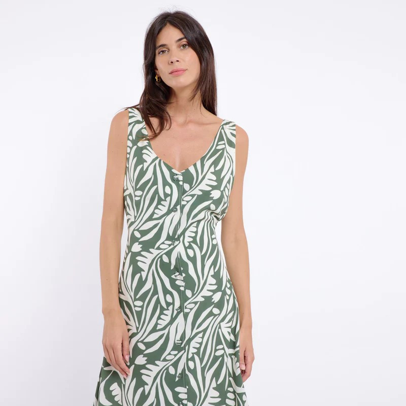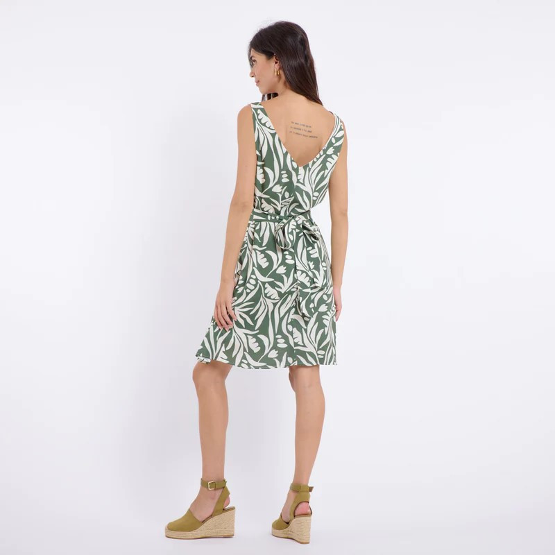 Robe courte à bretelles forme trapèze, un col V sur le devant mais aussi sur le dos. Une patte de boutonnage avec les boutons assortis au tissu. Une ceinture qu'on peut nouer devant ou derrière. Un motif floral kaki et blanc. Robe très agréable 100% viscose.