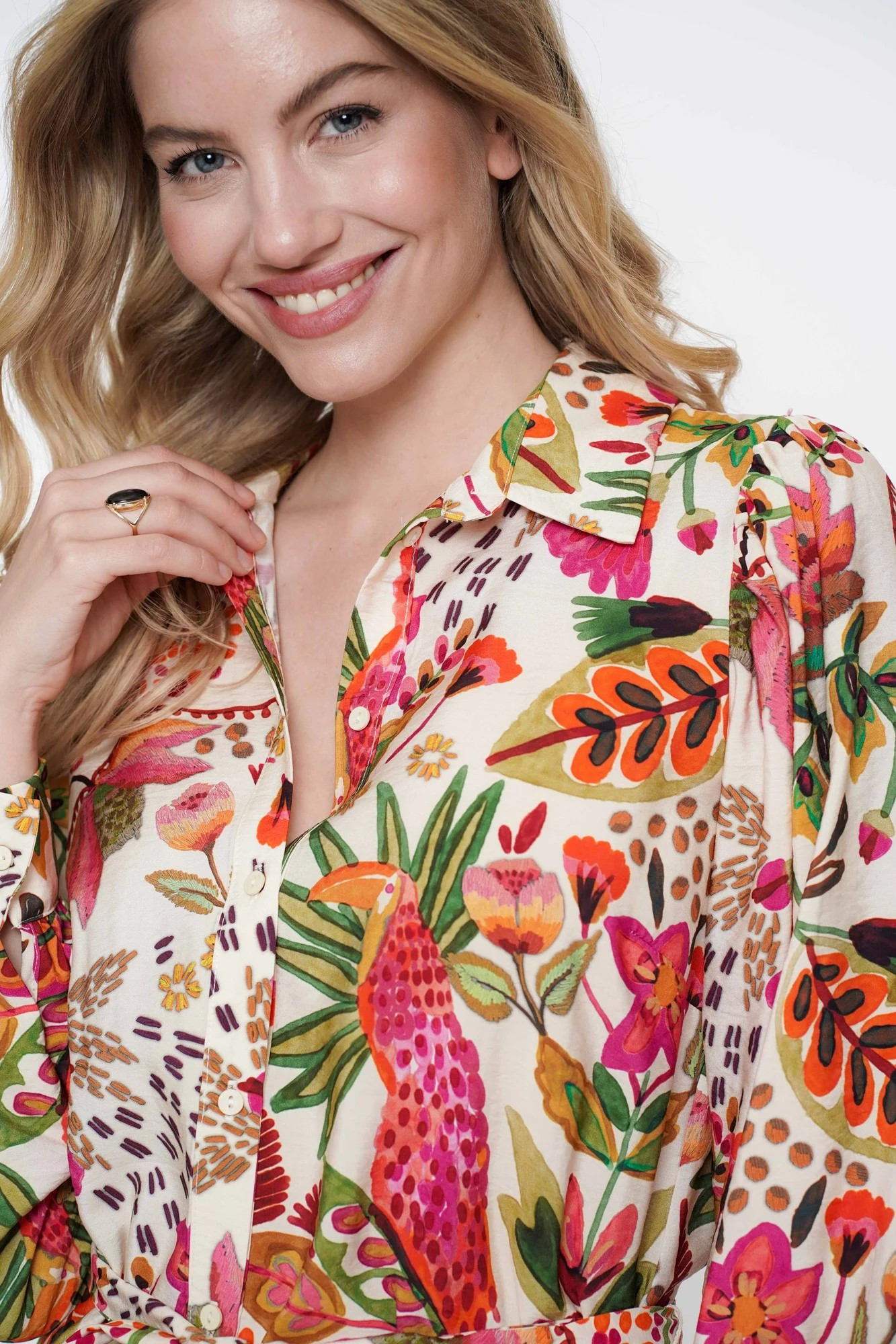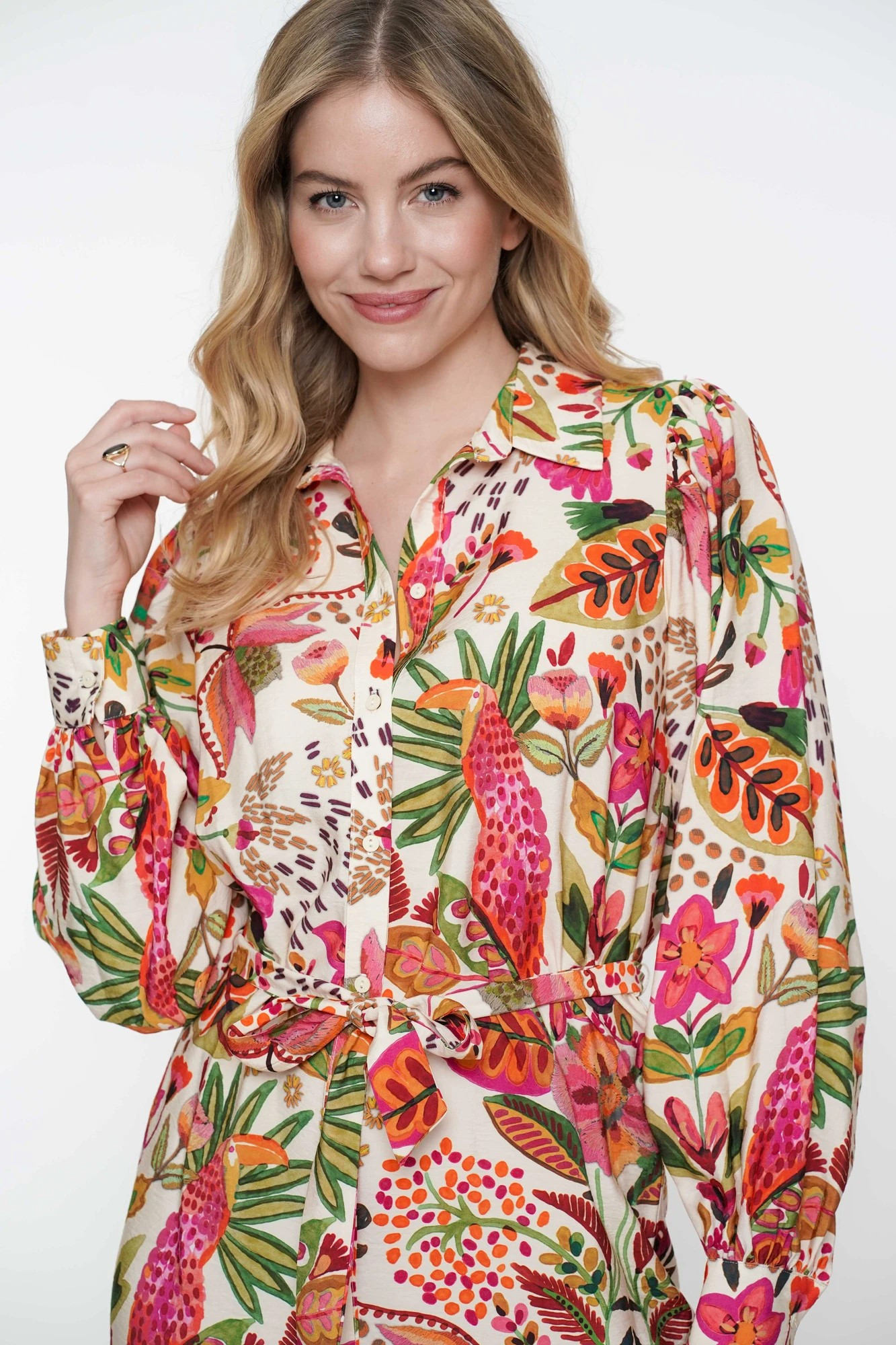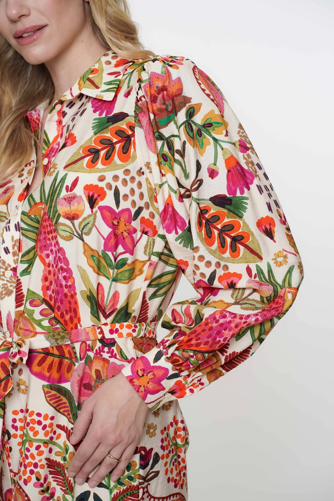 • Imprimé : perroquet feuillage et fleurs colorées sur toute la surface