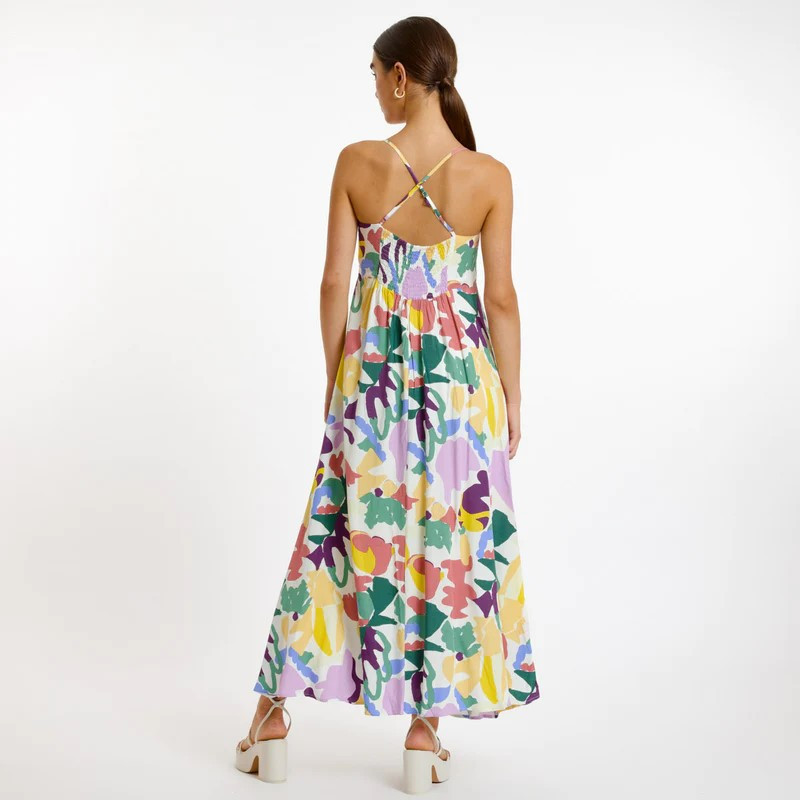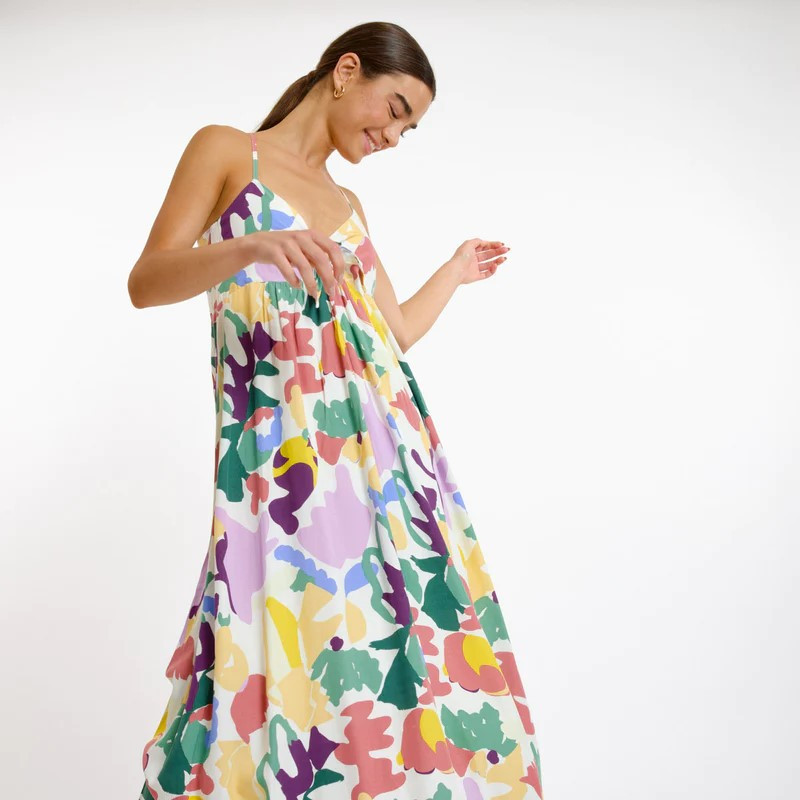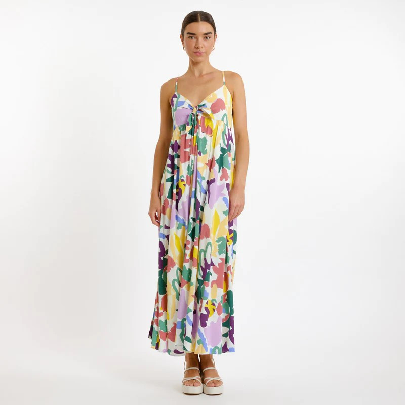 " Un anniversaire, une soiréé, une cérémonie ... Cette robe longue colorée sans manches, avec ces fines bretelles réglables, ce col v avec le noeud pour la fantasie, son motif artistique vont vous faire craquer "