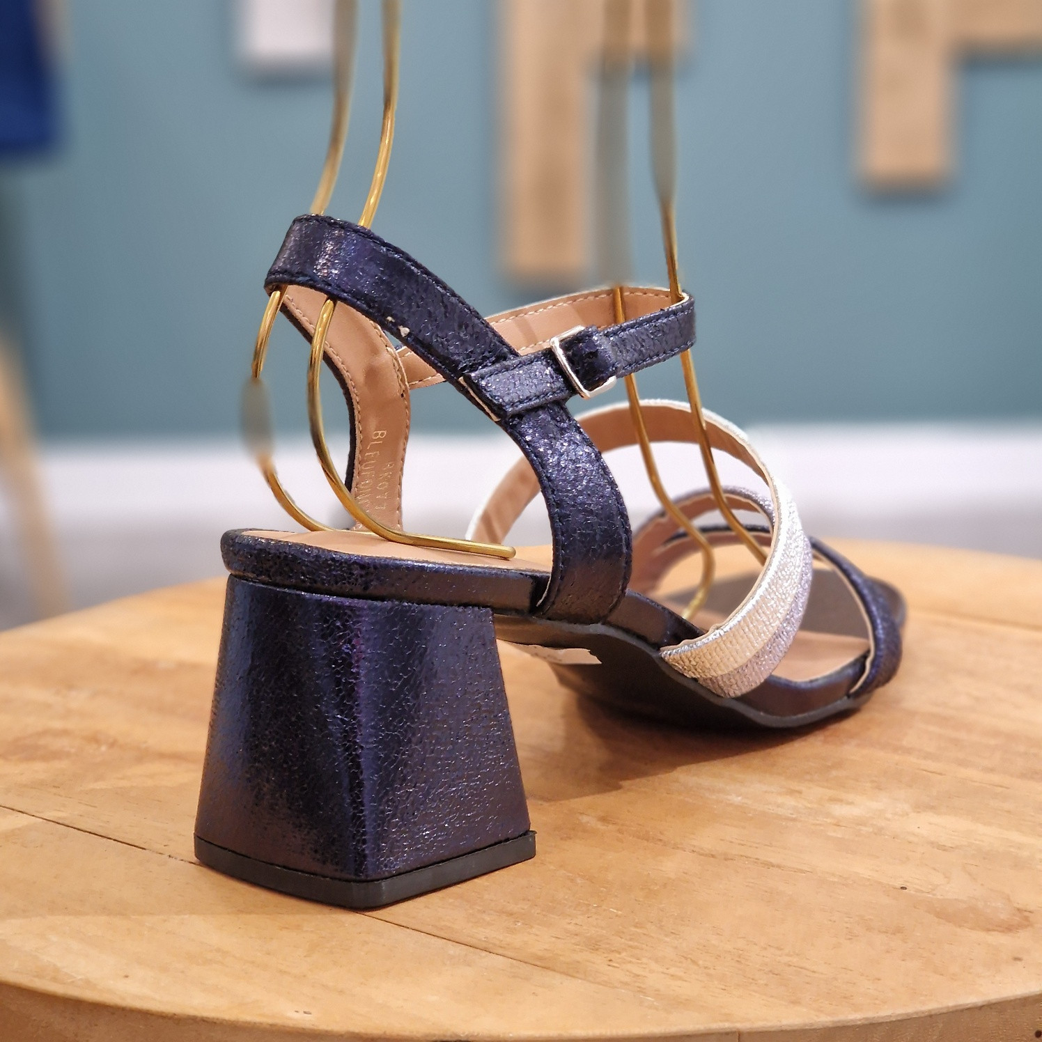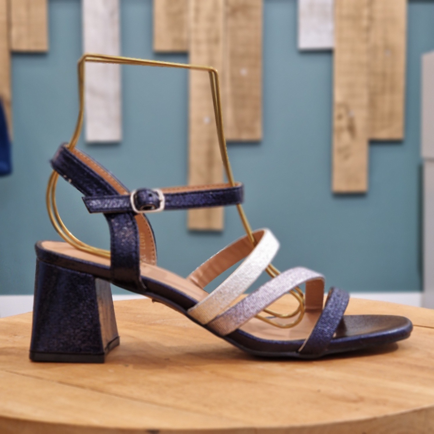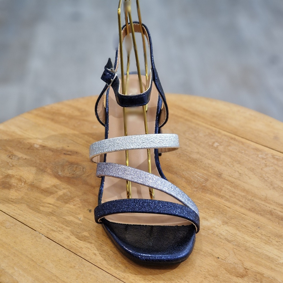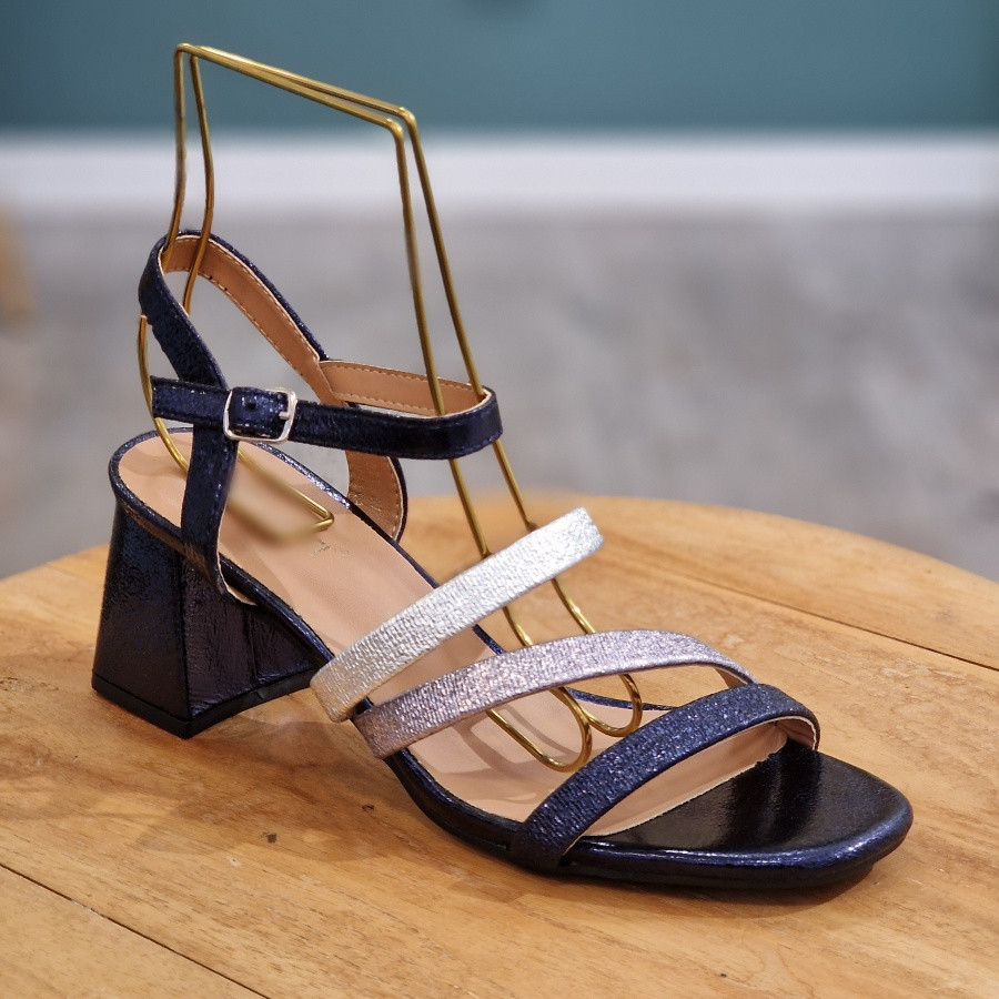 Sandale marine à talon, avec bride argentée, bleu et marine et bride réglable à la cheville. Talon de 6 cm. Très tendance.