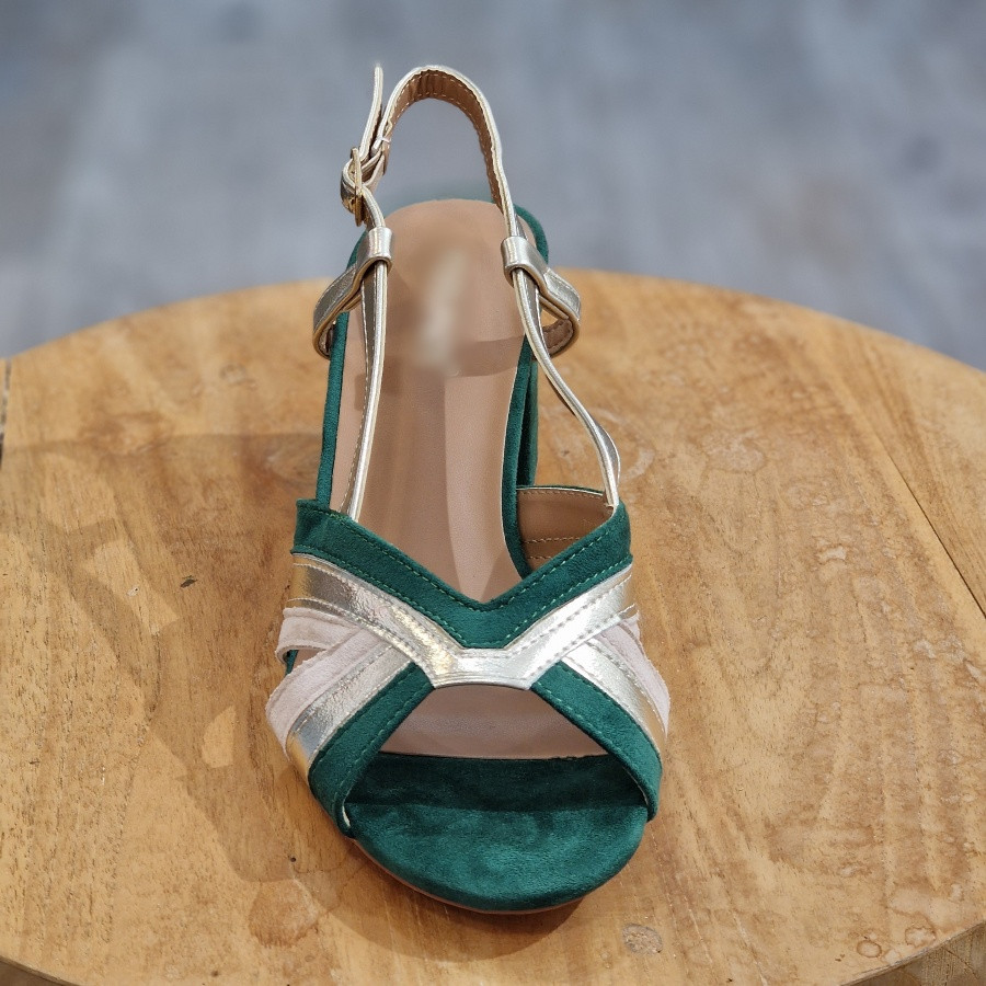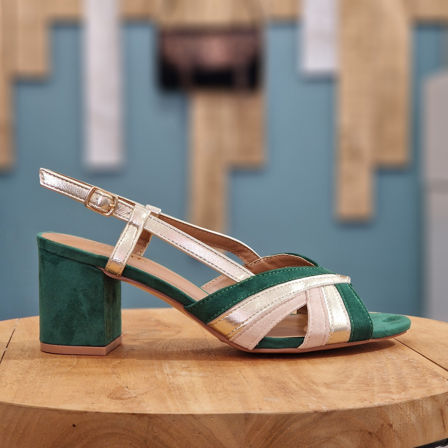 Sandale verte à talon, avec brides dorés et beige et bride réglable à la cheville. Talon de 7 cm. Très tendance.