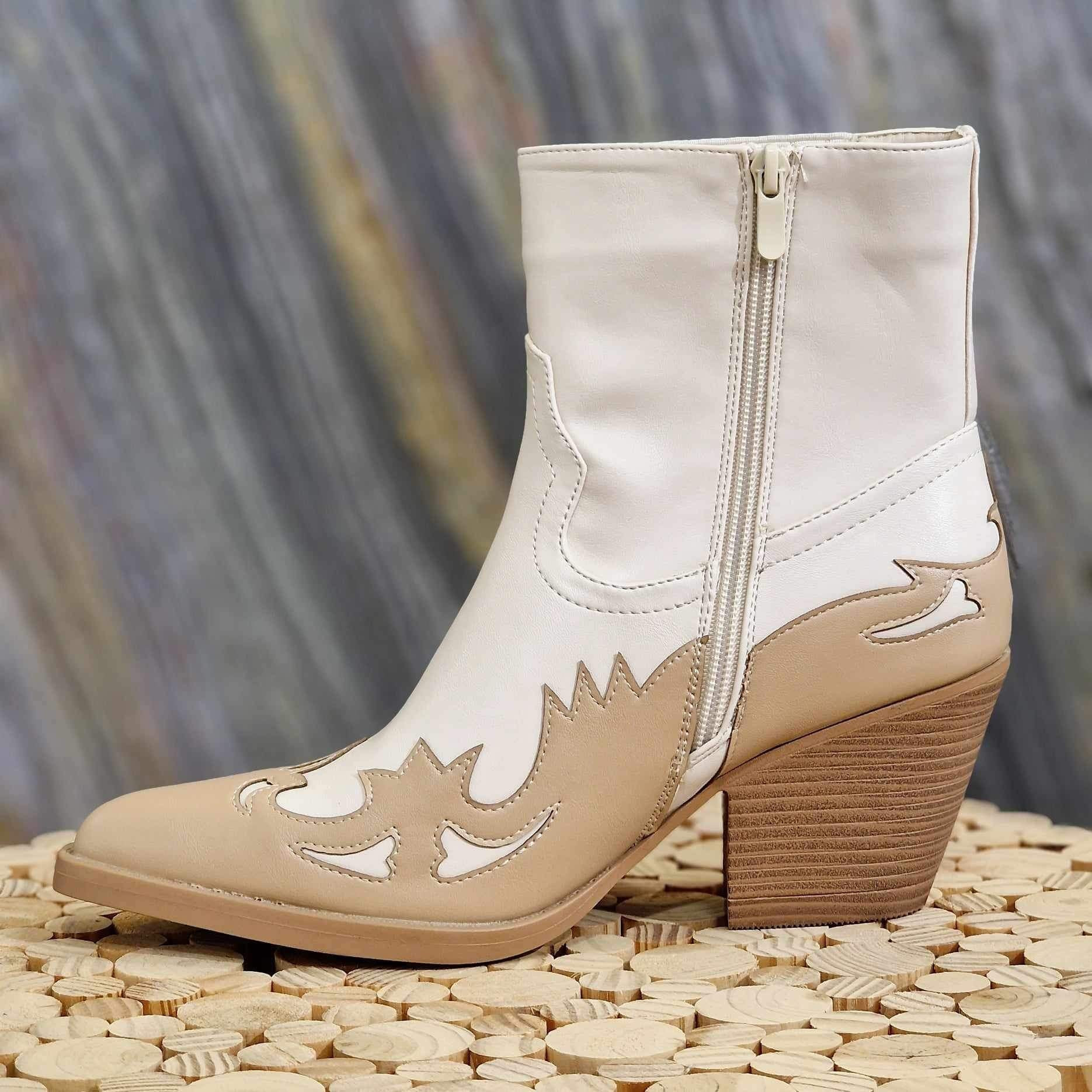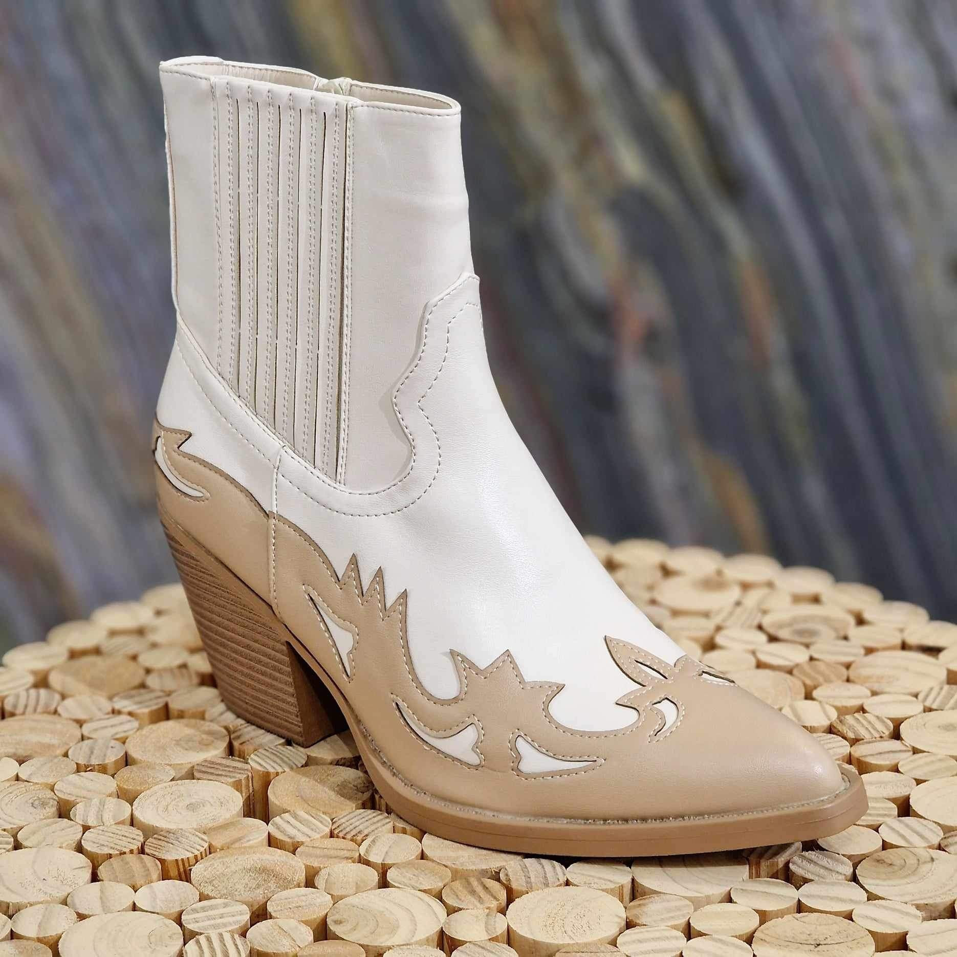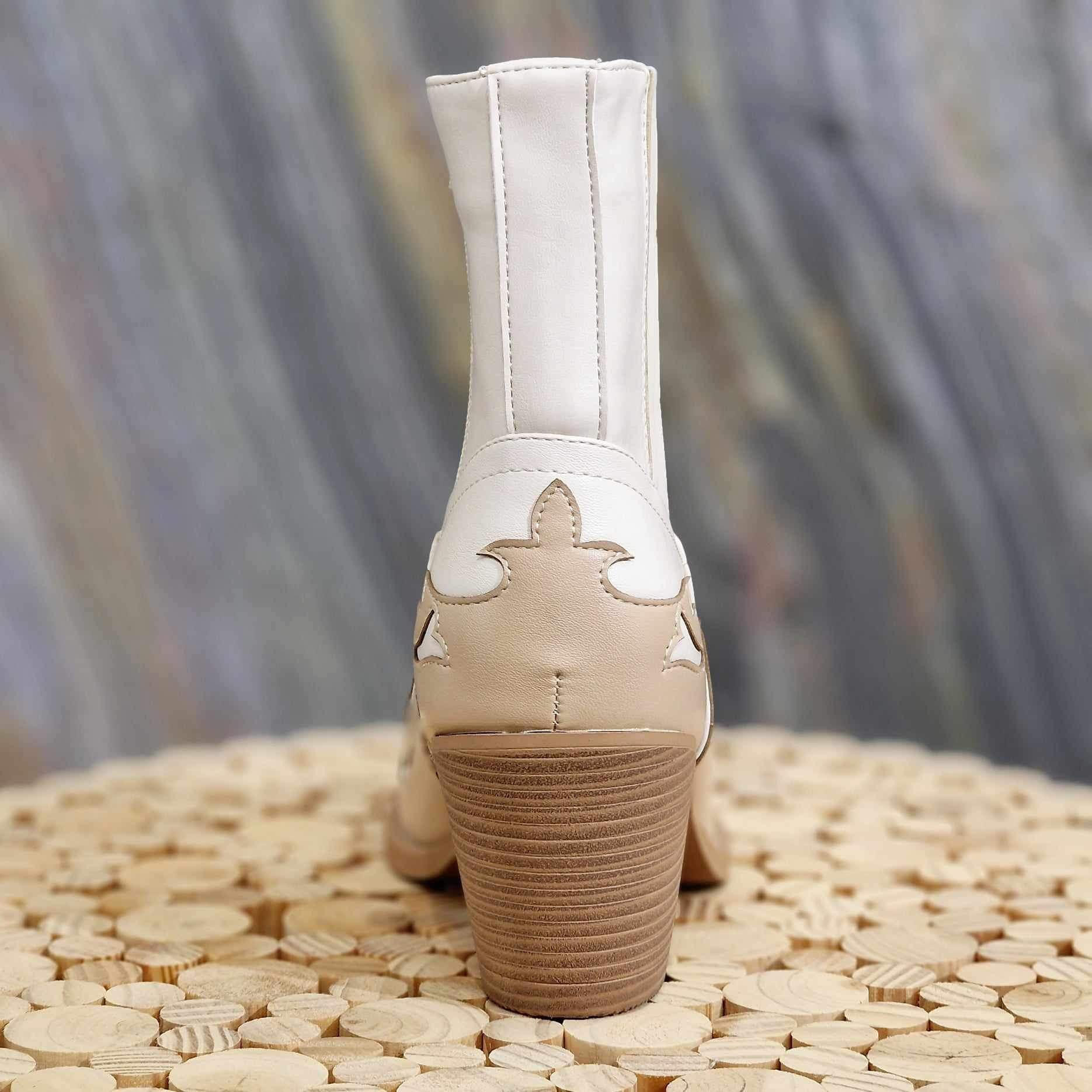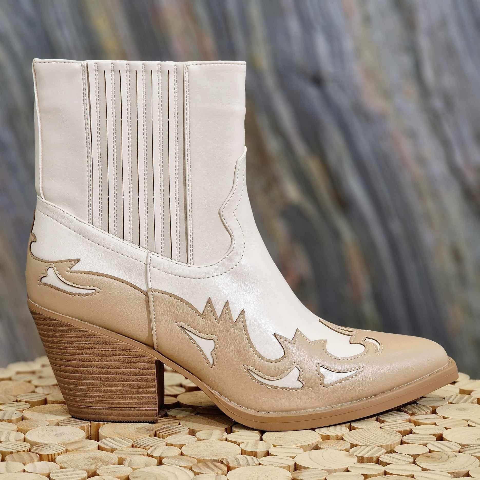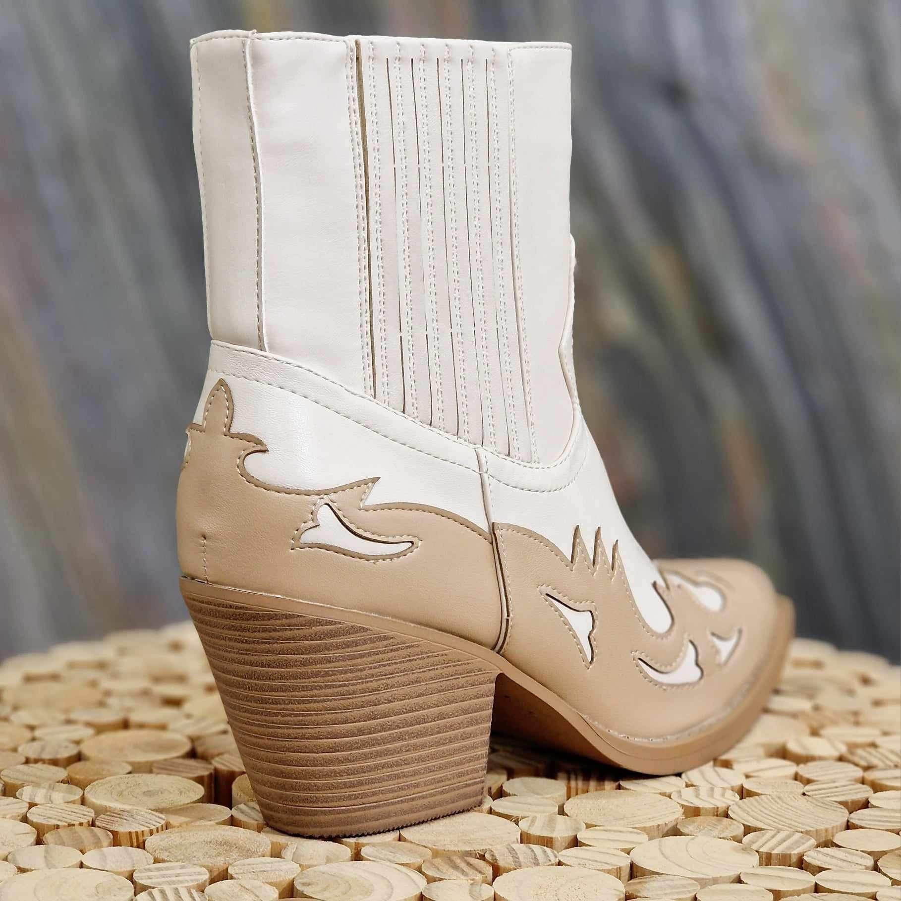 Santiag beige et camel, avec détails bi-couleur. Talons de 5 à 7 cm. Forme pointue à bout carré sur le devant. Elastique sur le côté extérieur pour l'aisance et fermeture éclair à l'intérieur de la chaussure.