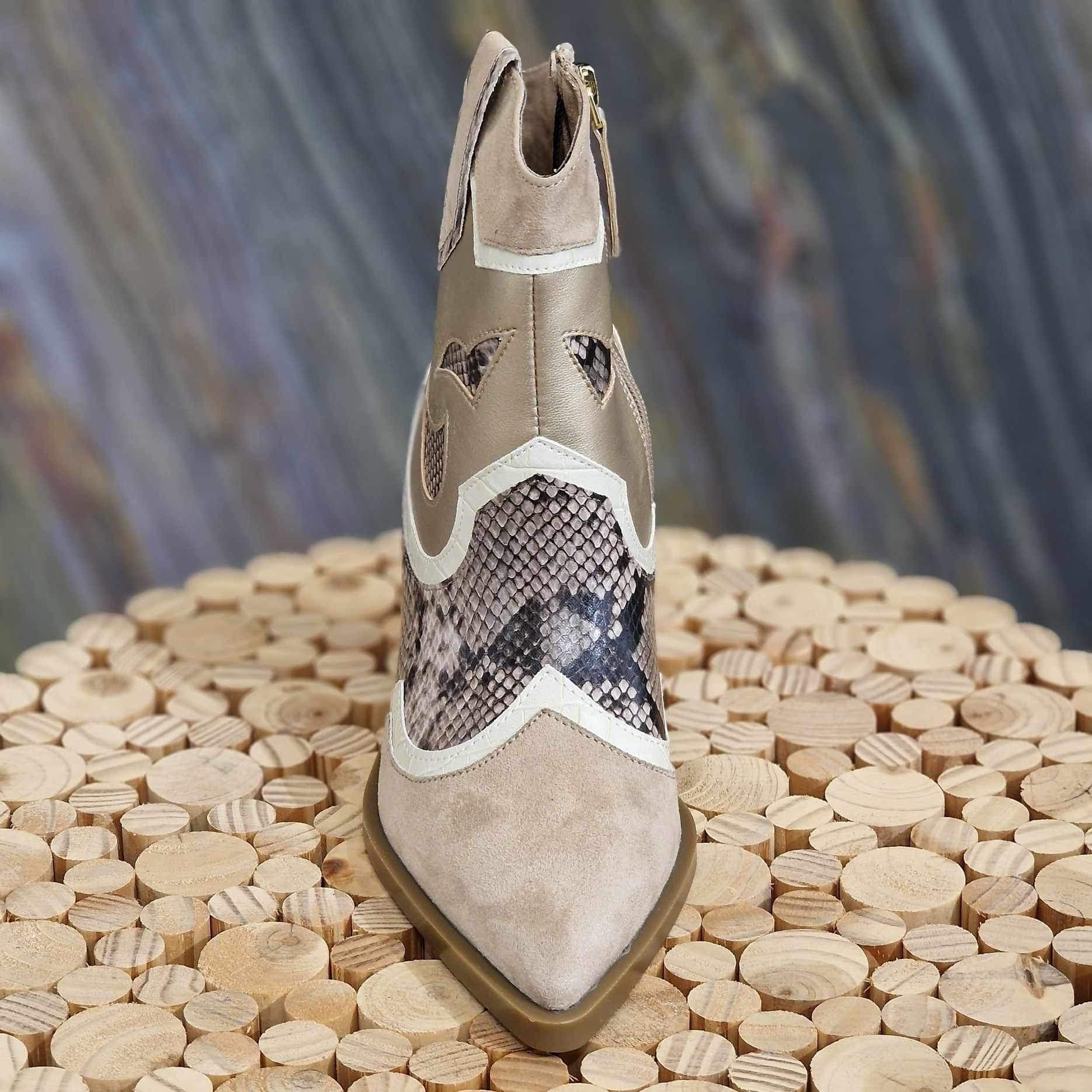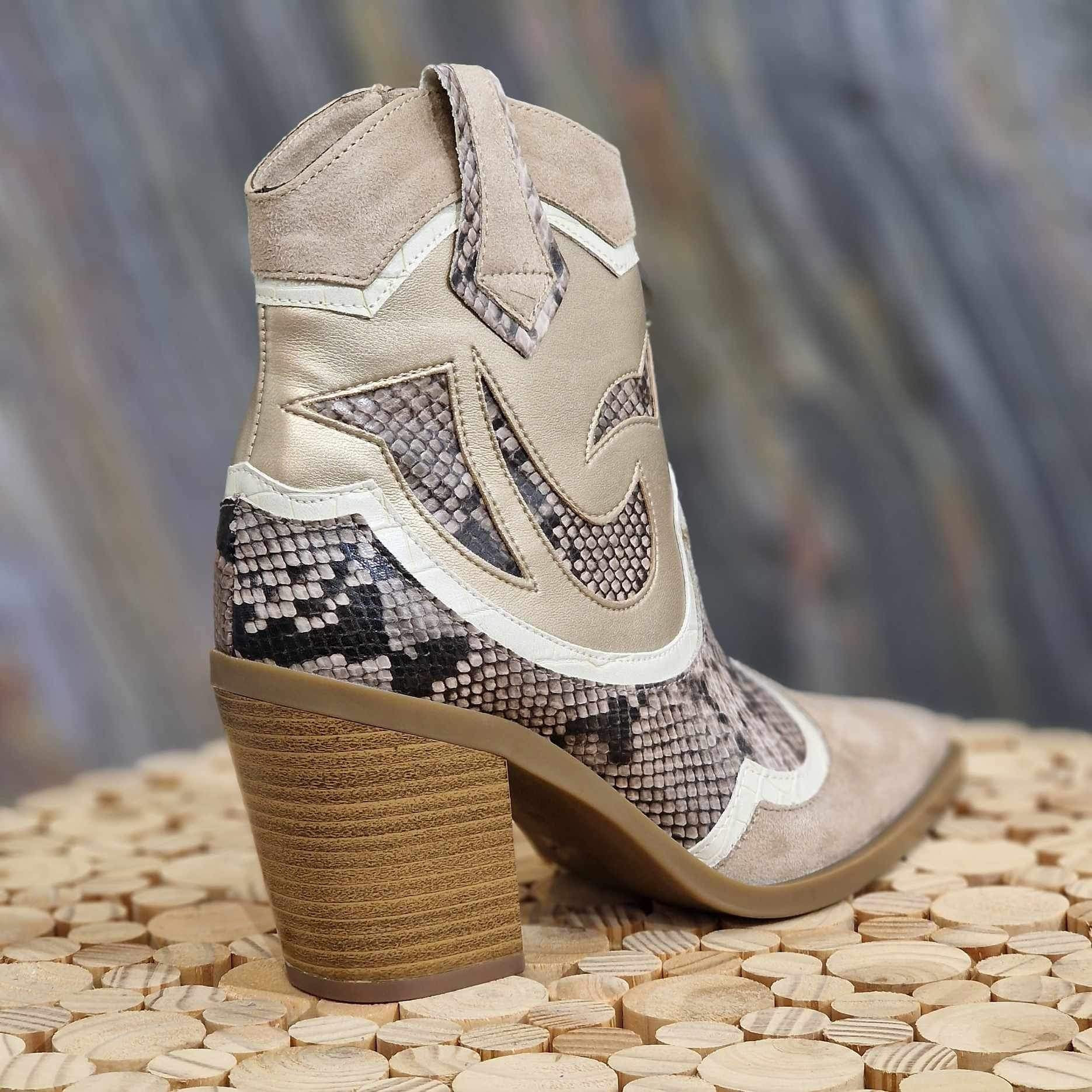 Santiag similicuir avec aspect reptile et daim beige et blanc. Talons de cm. Forme pointue, avec découpe arrondi sur le haut de la chaussure. Avec fermeture éclair intérieur.