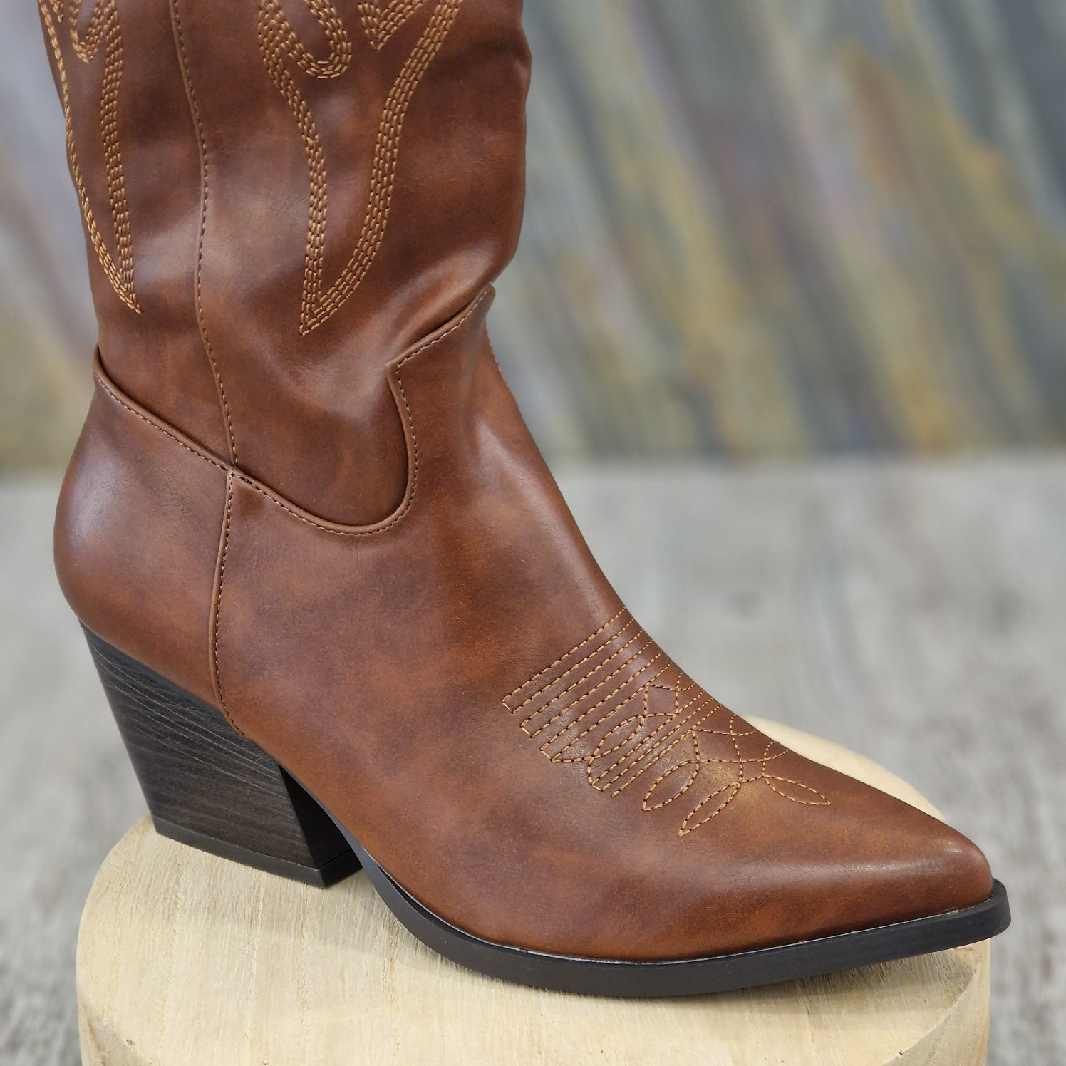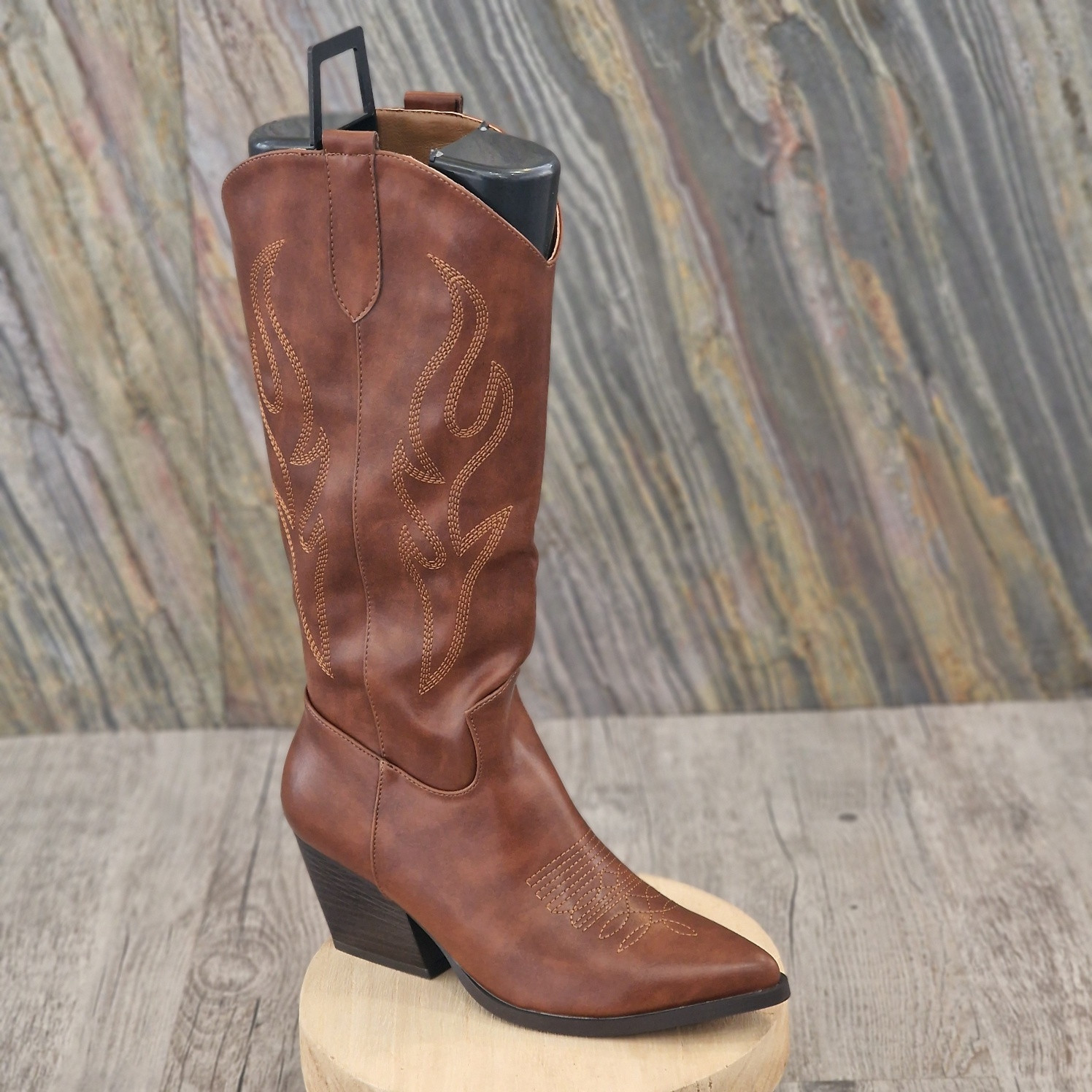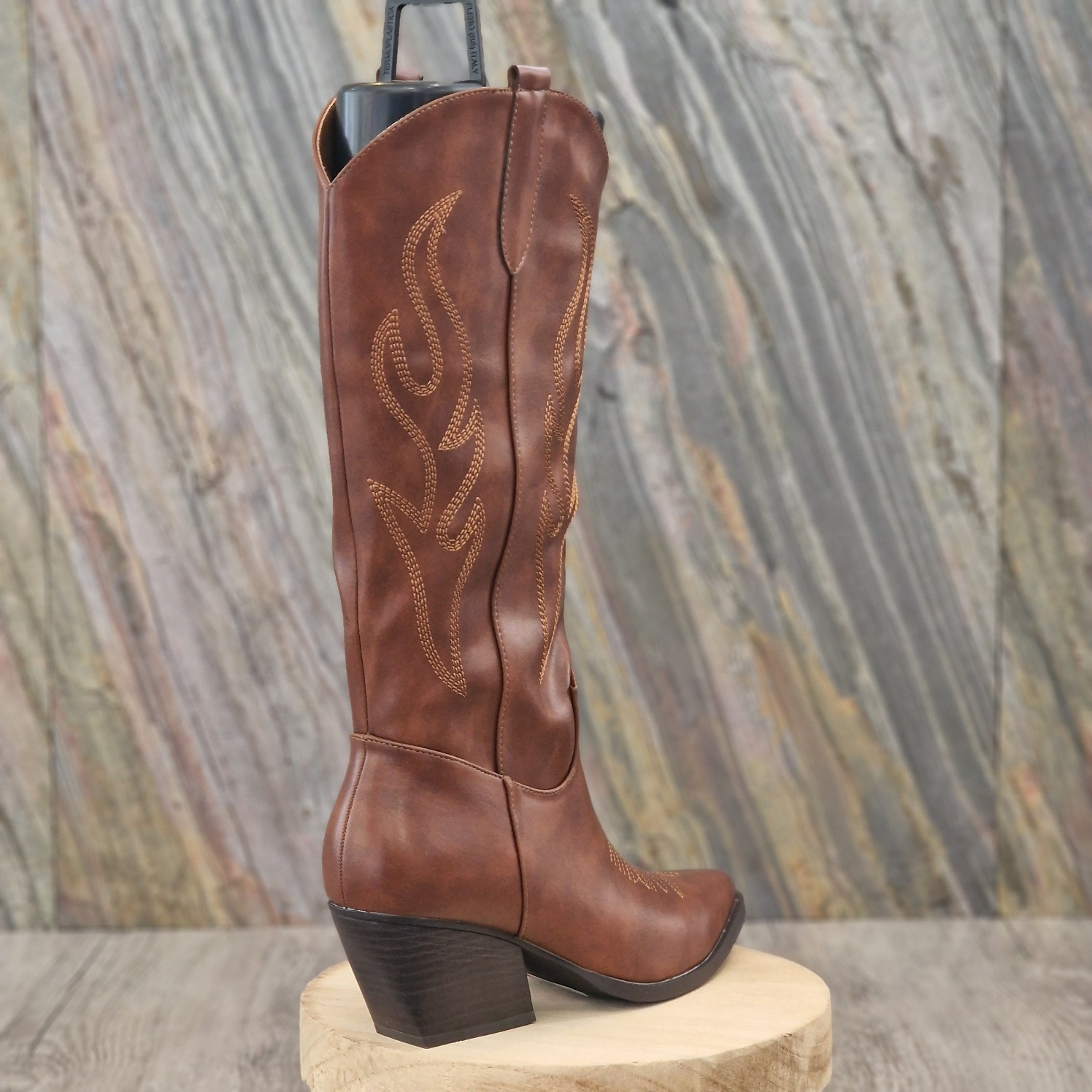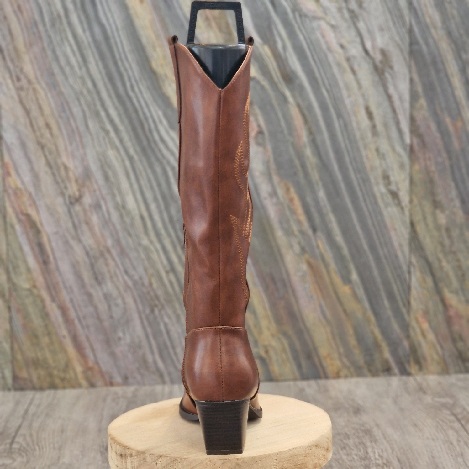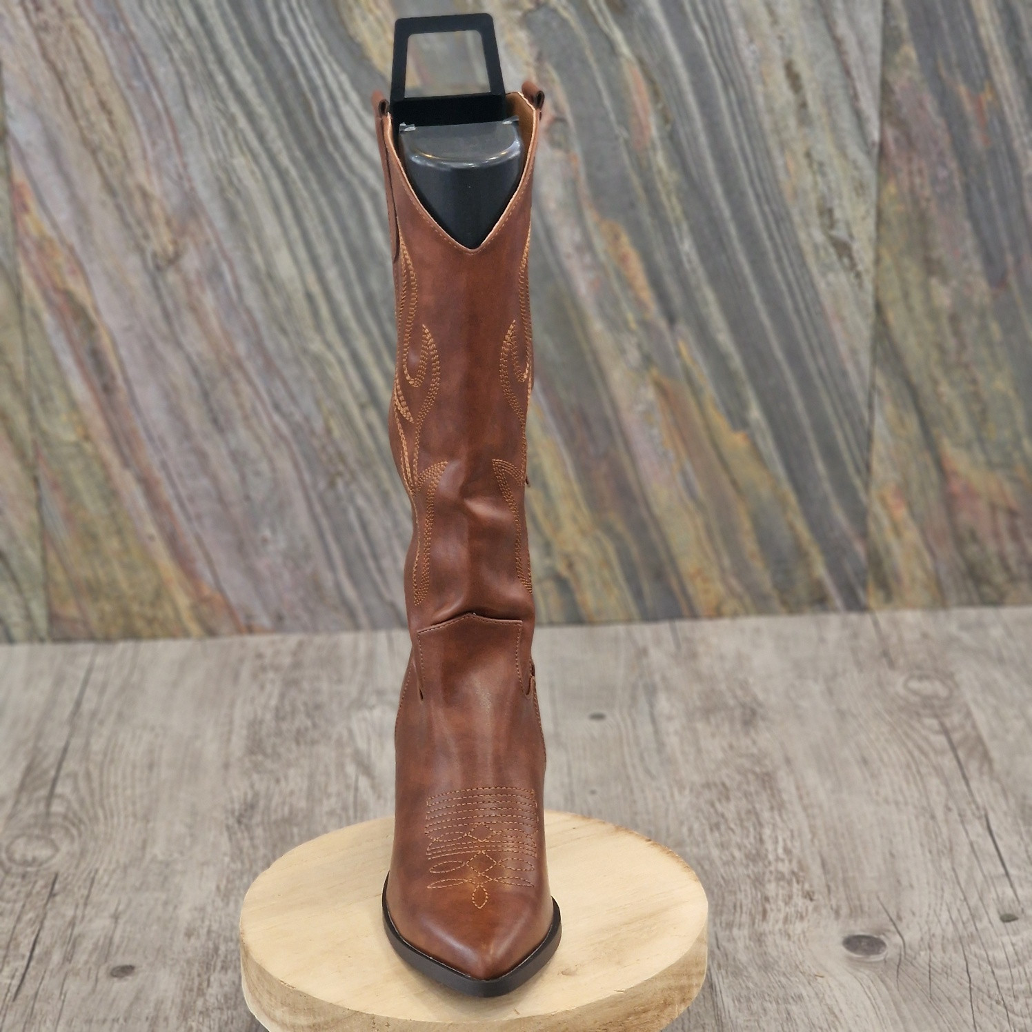 Santiag haute en similicuir brossé camel, avec les détails de surpiqûres camel. Talon carré de 7 cm. Forme pointue sur le devant. A une fermeture éclair à l'intérieur de la chaussure.