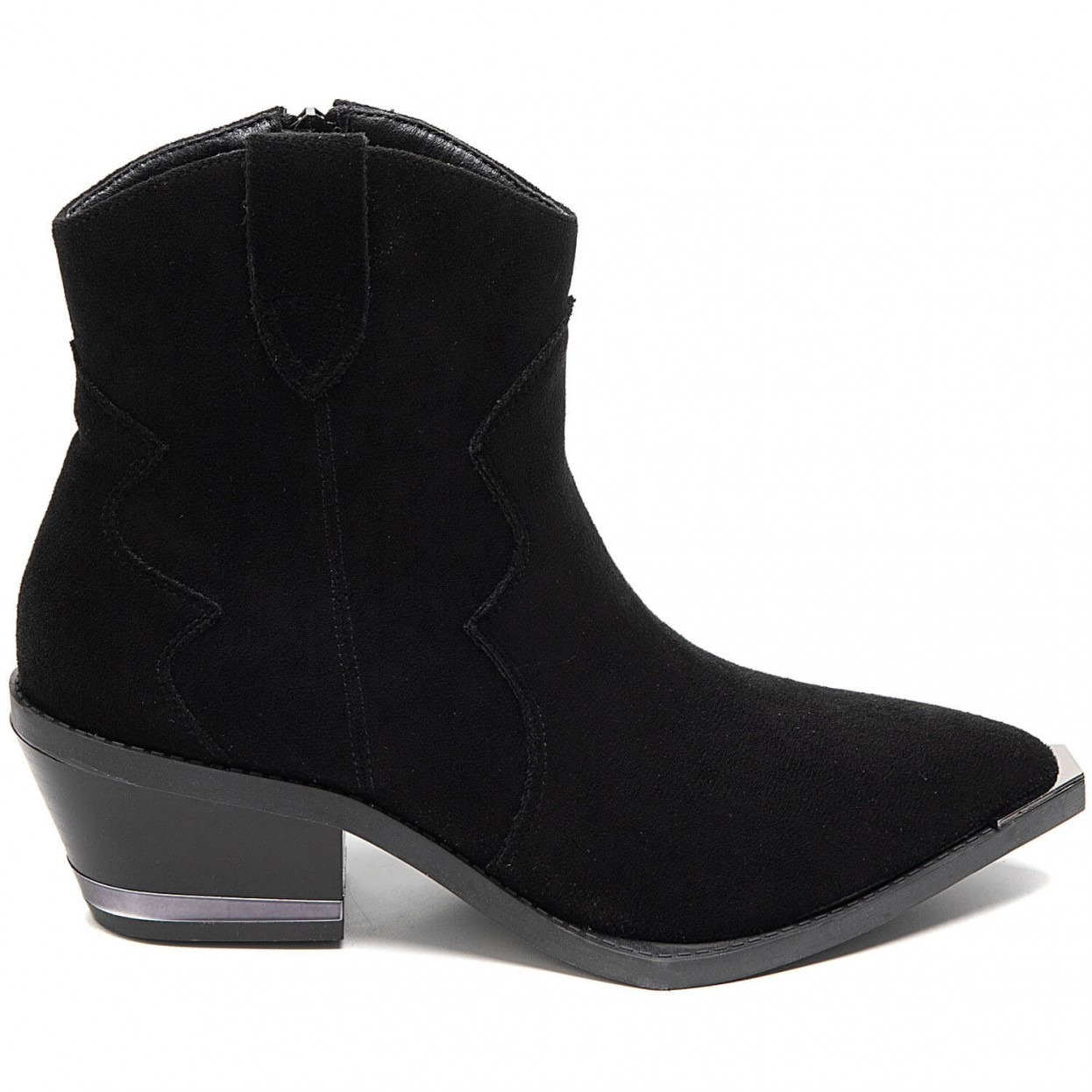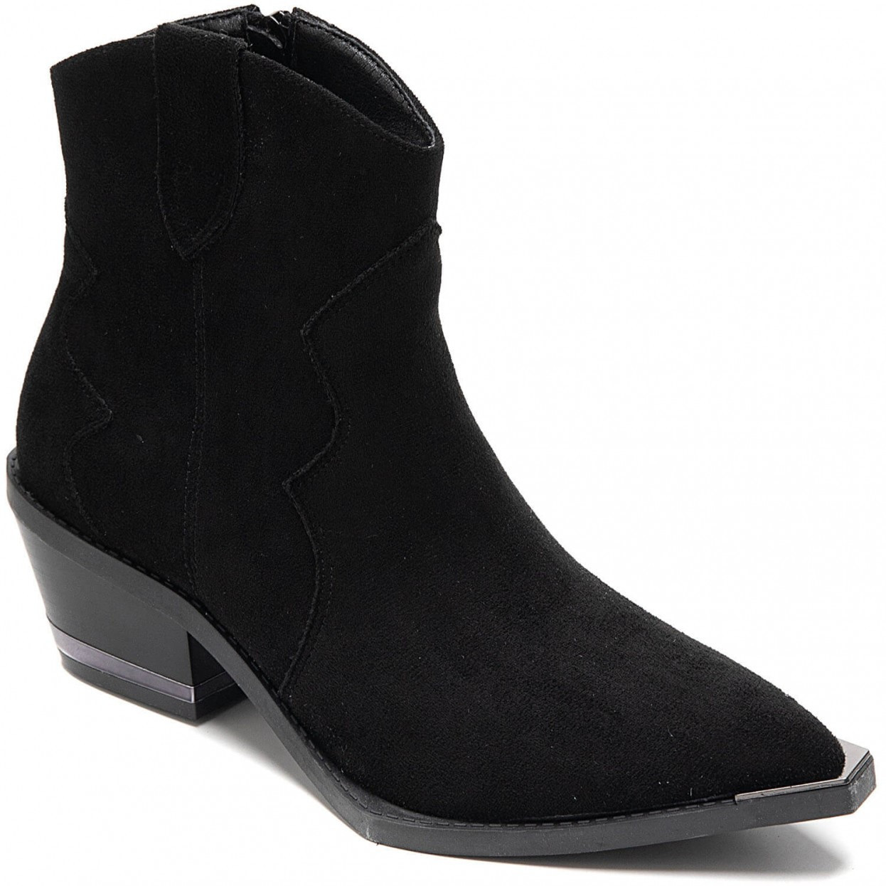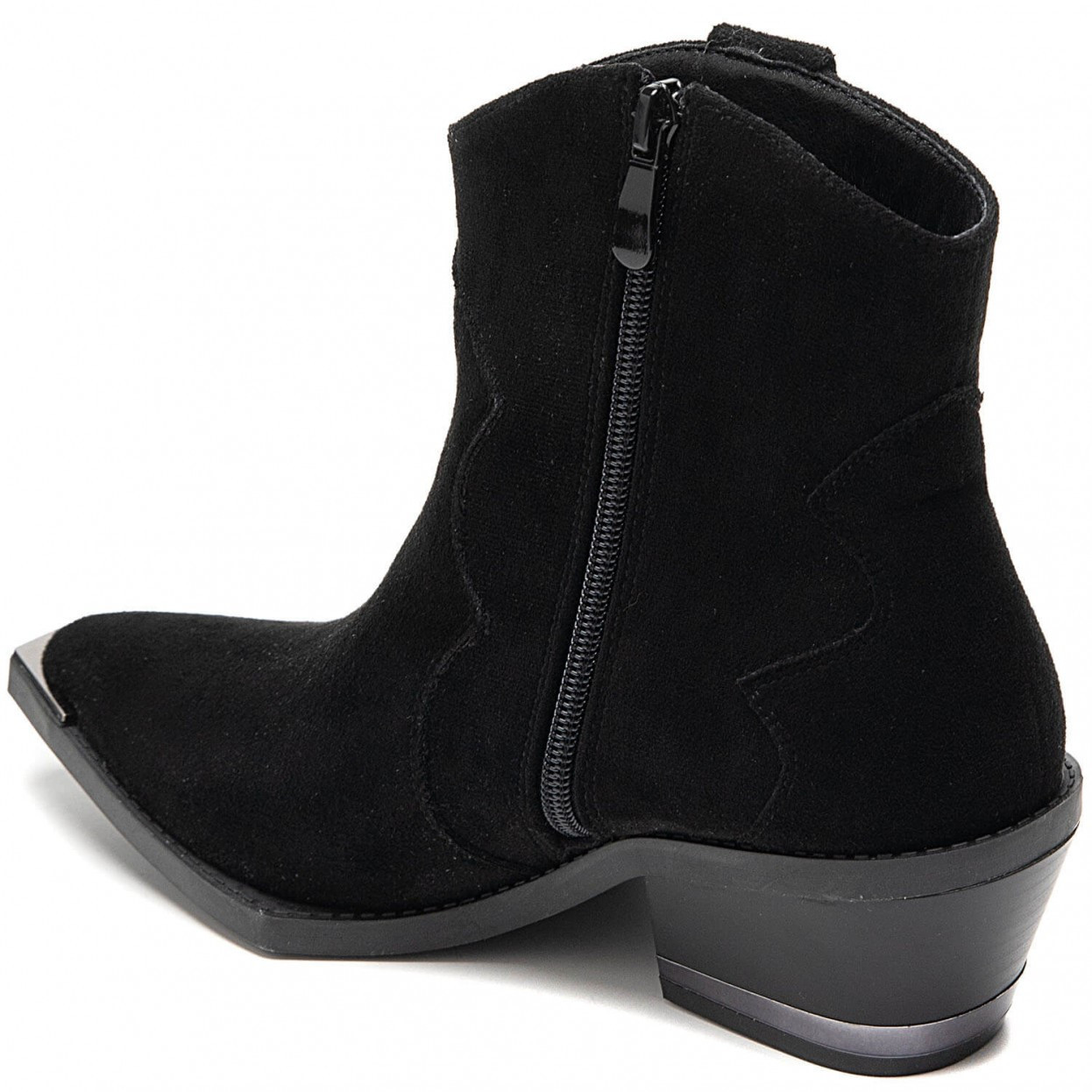 Santiags en suède noires, avec empiècements sur la boots. Il y a une belle découpe à la cheville, avec les détails argentés sur le devant et sur le talon.