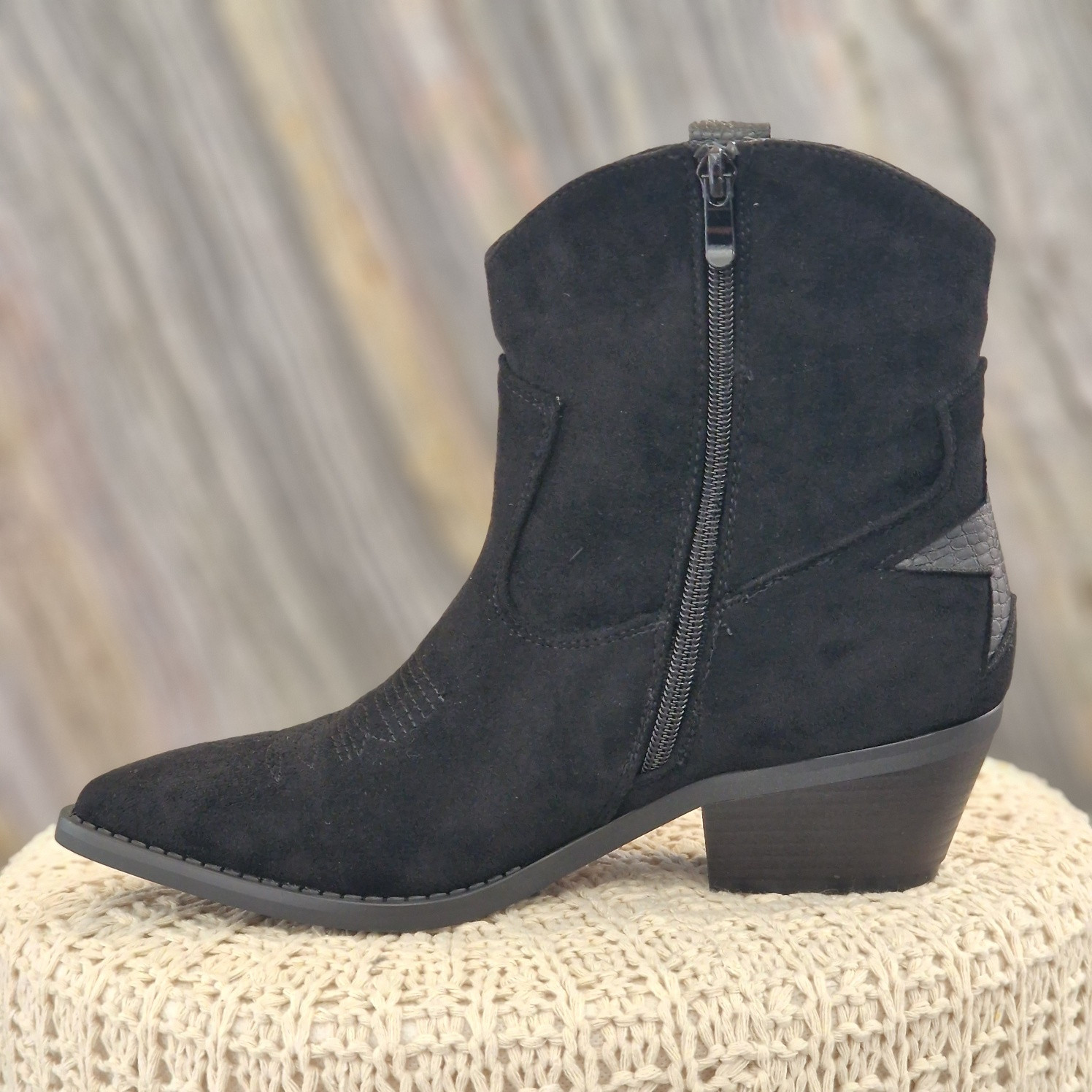 Santiag courte en nubuck noir, avec aspect reptile sur l'étoile de l'arrière. Talons de 5 cm. Forme pointue sur le devant, et découpe arrondi sur le haut de la chaussure. Avec fermeture éclair intérieur.