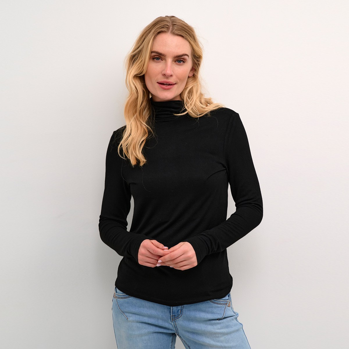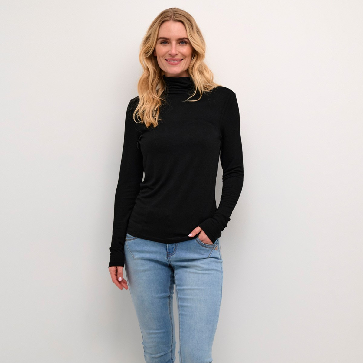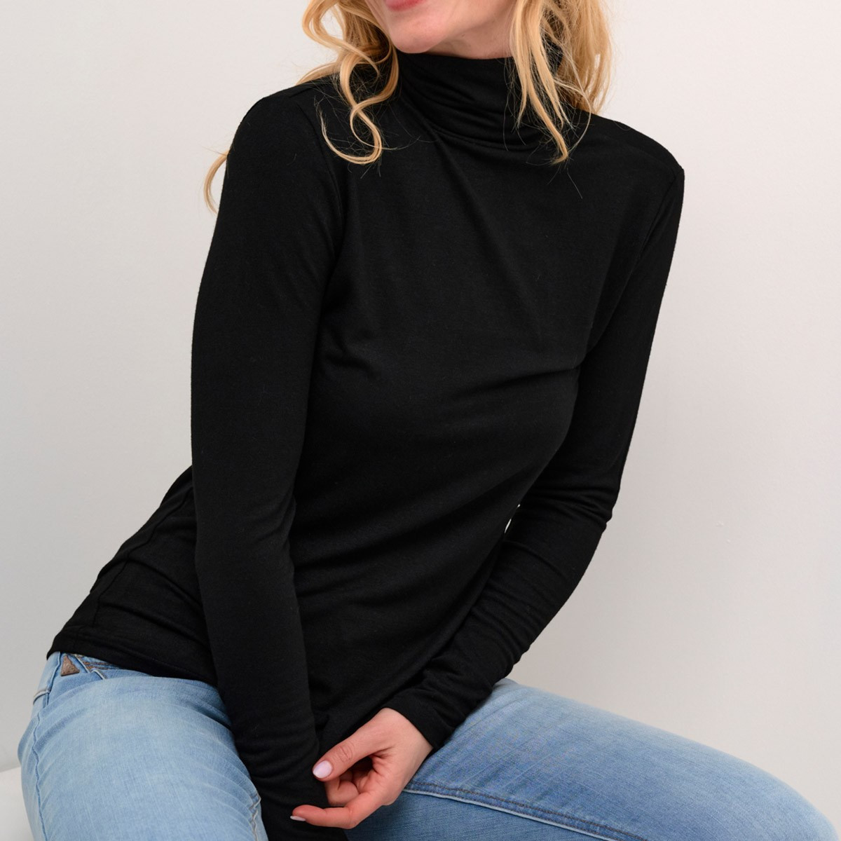 Ce sous pull uni noir de la marque Cream est travaillé et très élégant. D'une coupe cintré, qui descend jusque sur la hanche, il offre un style chic à combiner avec vos pantalons ou jupes de votre dressing. Il a des manches longues avec un col roulé, en maille très fine. Il allie qualité et chic pour vos tenues.