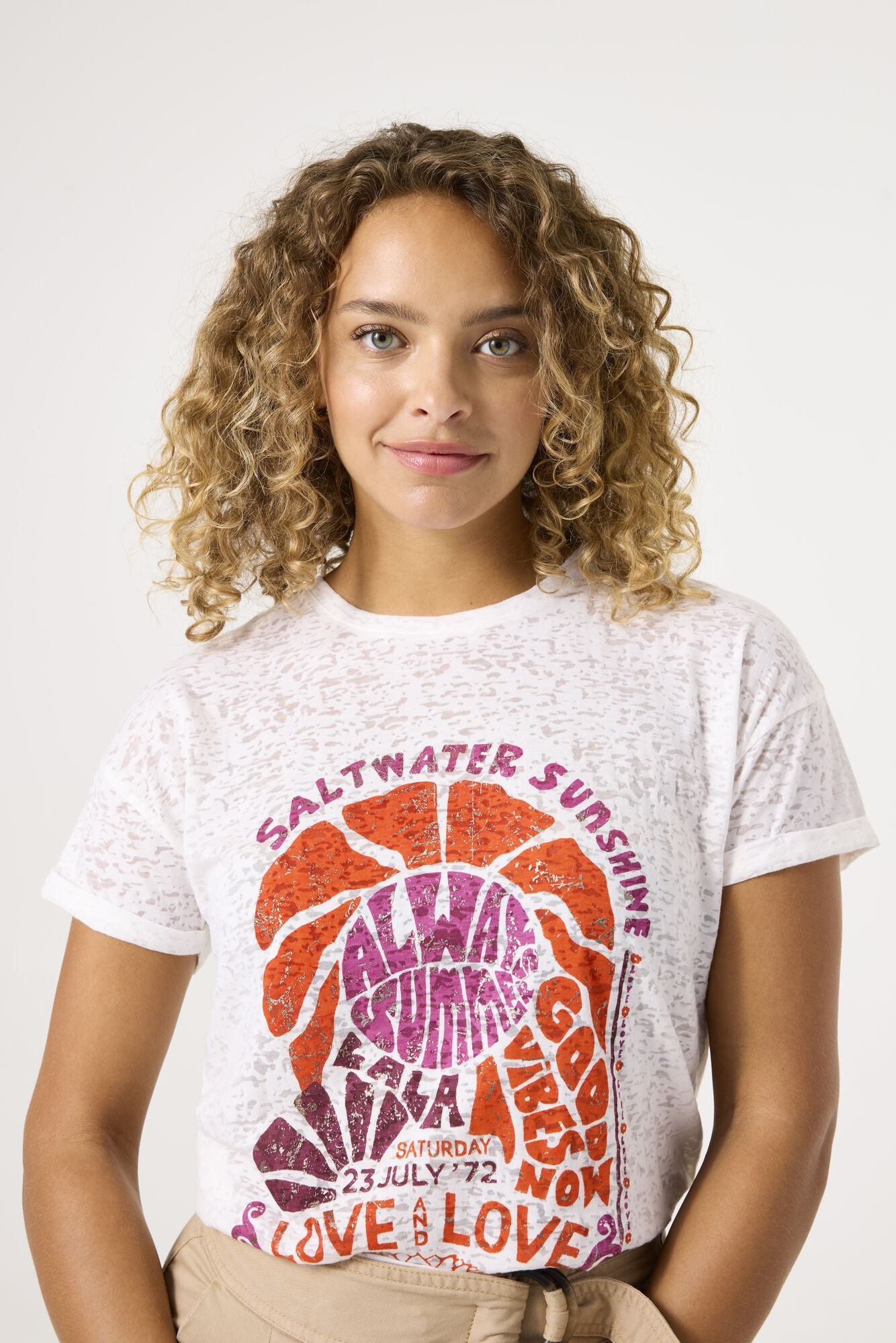 T-shirt avec effet burnout et imprimé sur la poitrine. Une pièce à l’imprimé tendance. Ce t-shirt a des manches courtes, un col rond et une coupe à épaules tombantes. Cet article est composé à 40 % de polyester recyclé, 30 % de coton et 30 % de coton recyclé.