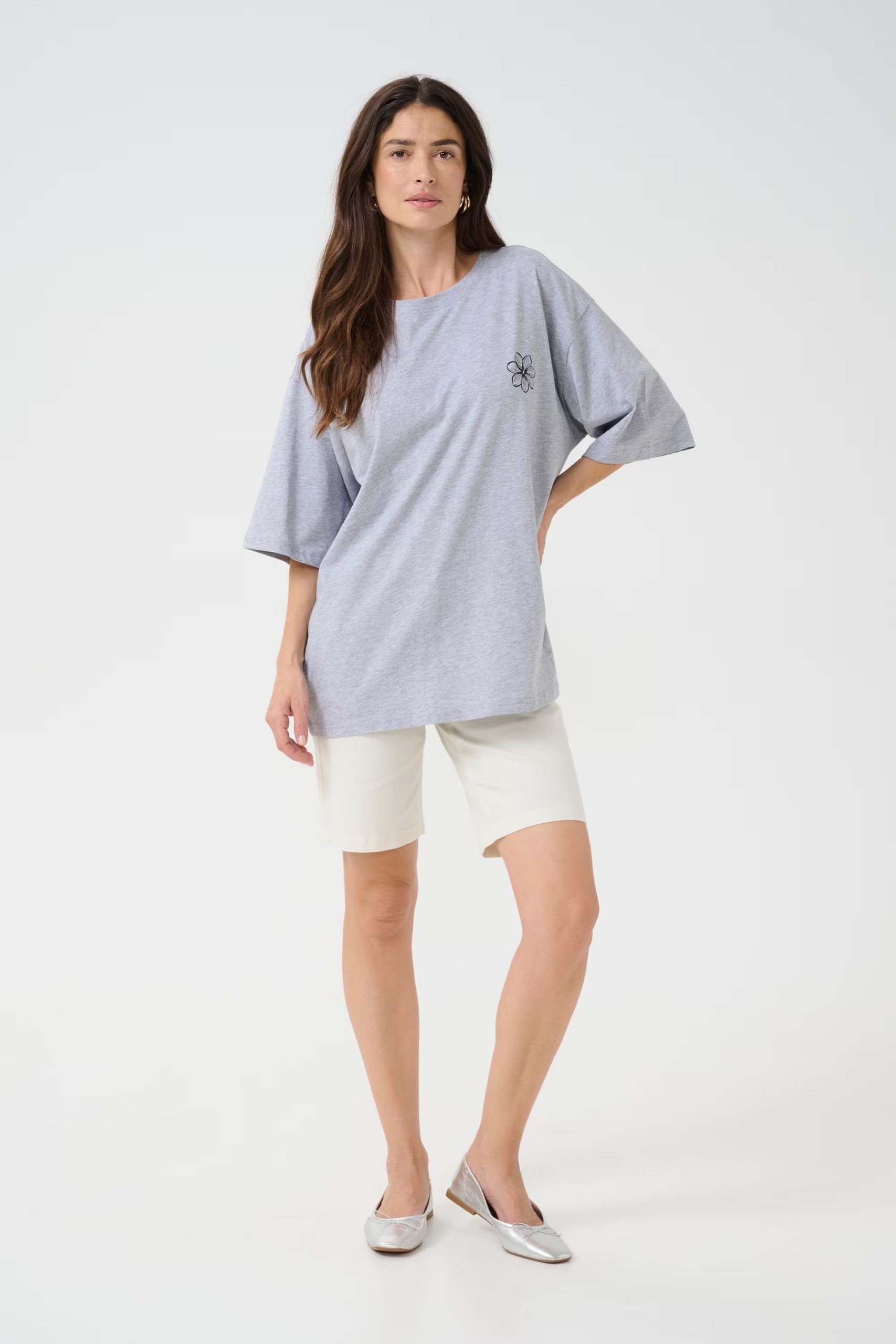 T-shirt gris, avec fleur sur le devant poitrine gauche, avec imprimé floral sur le dos. Il se porte oversize, qui descend jusqu'en dessous de la hanche. Il est très tendance par sa coupe et par son imprimé. Il offre un style chic à combiner avec vos pantalons ou jupes de votre dressing. Il a des manches courtes avec un col rond. Il allie qualité et chic pour vos tenues.
