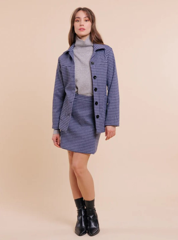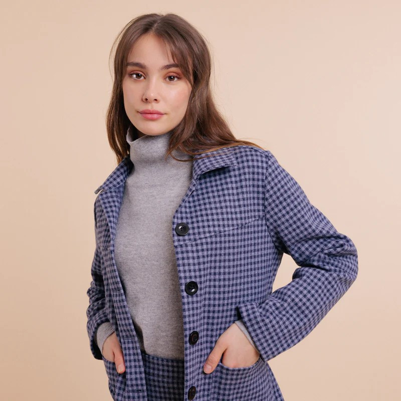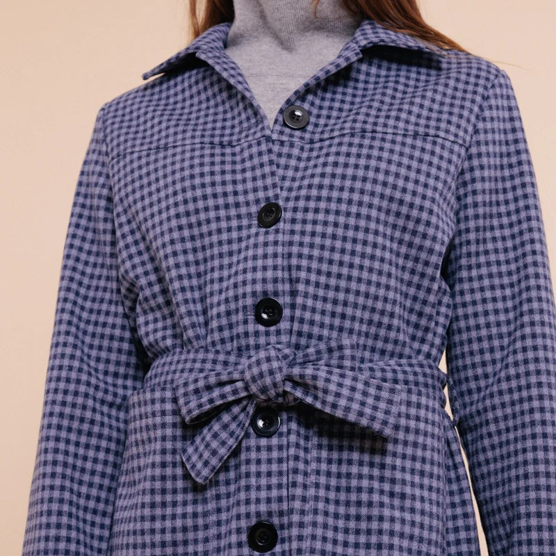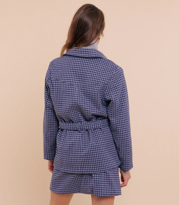 Veste droite mi-longue vichy bleu/gris avec empiècement devant et dos, une patte de boutonnage et des gros boutons noirs, des poches latérales, une ceinture qu'on pourra nouer, un col classique, et des manches longues droites.