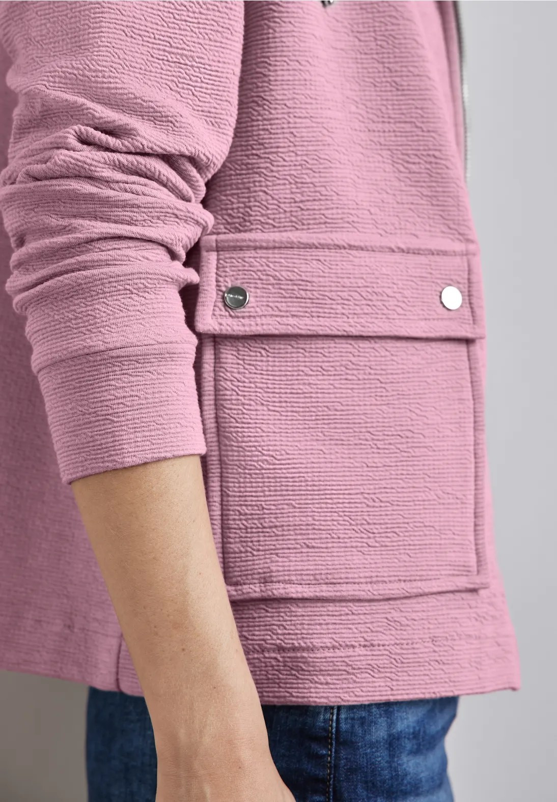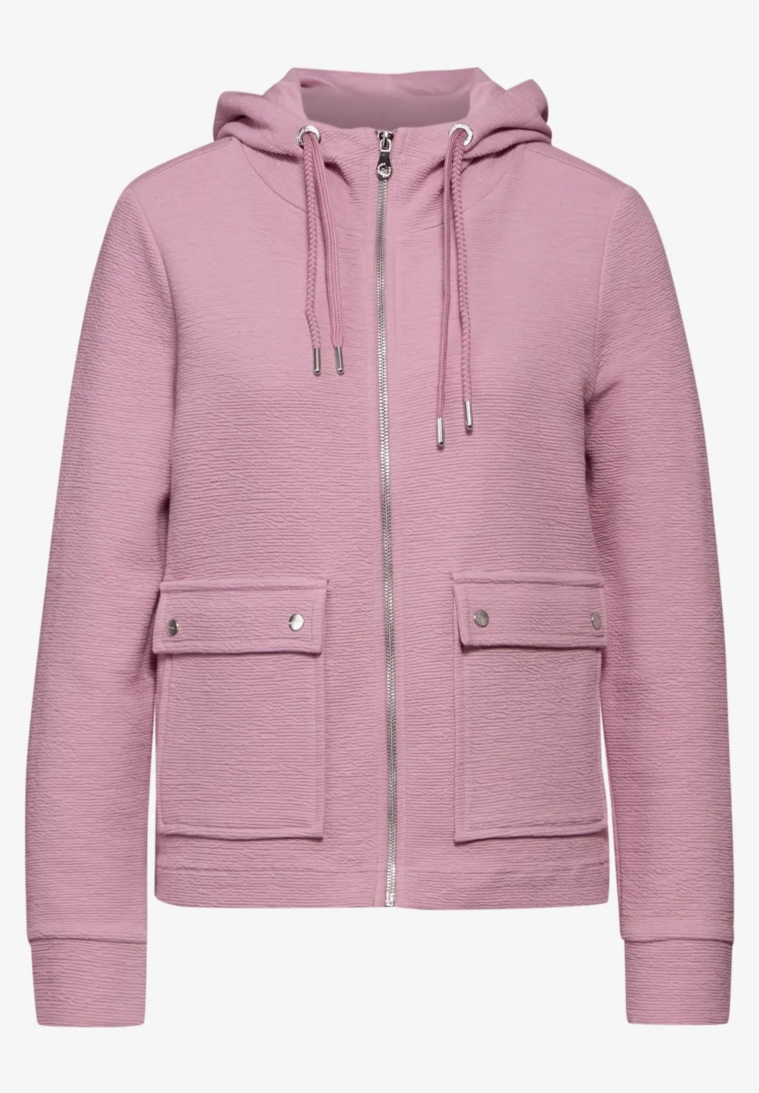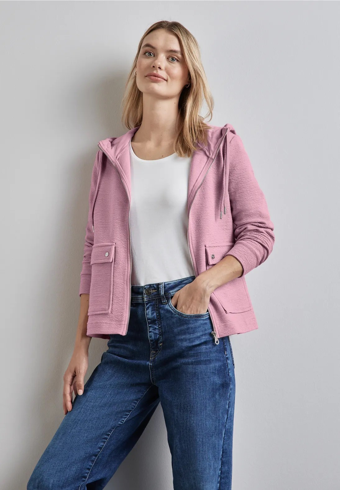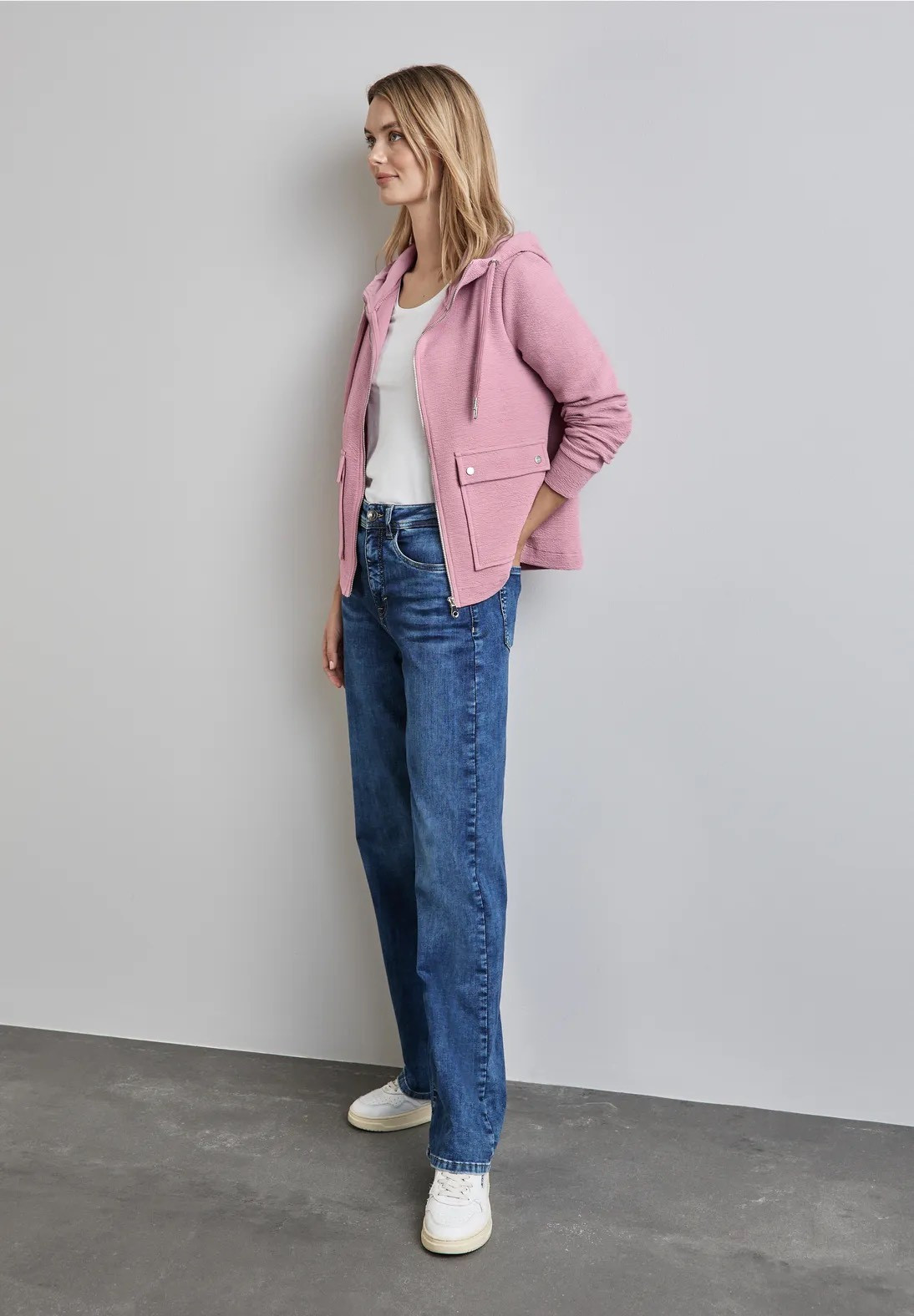 La veste à capuche de Street One pour femmes est une veste structurée avec une capuche et un cordon de serrage. La fermeture éclair et les poches latérales avec bouton la rendent particulièrement pratique. Un agréable mélange de coton avec une part de stretch offre un grand confort.